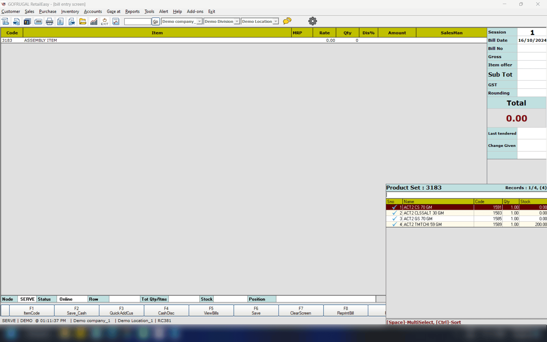Step 2: Select the assembly item from the item list. The product set window will popup. This is where you can select or deselect any item you want. Then press enter.