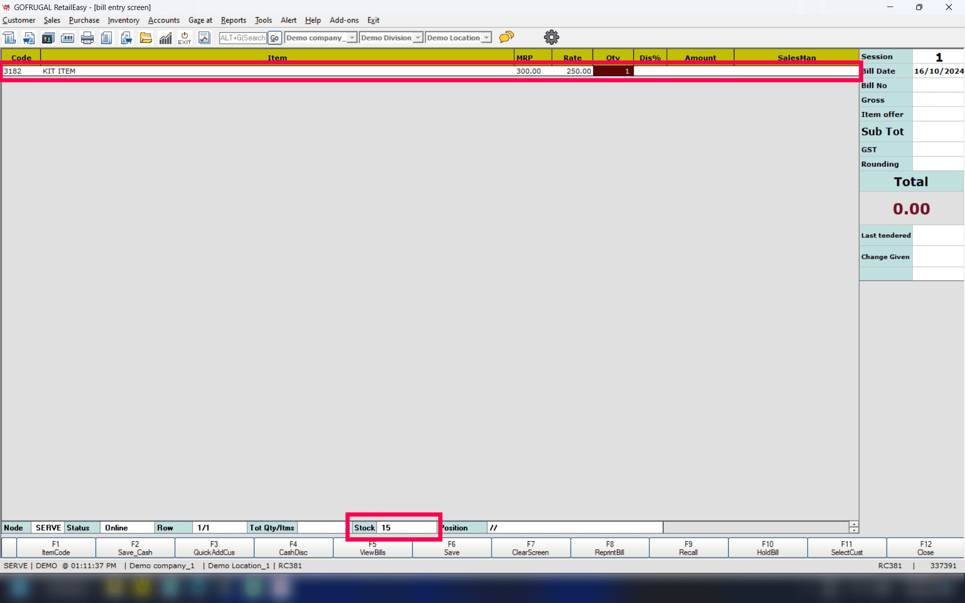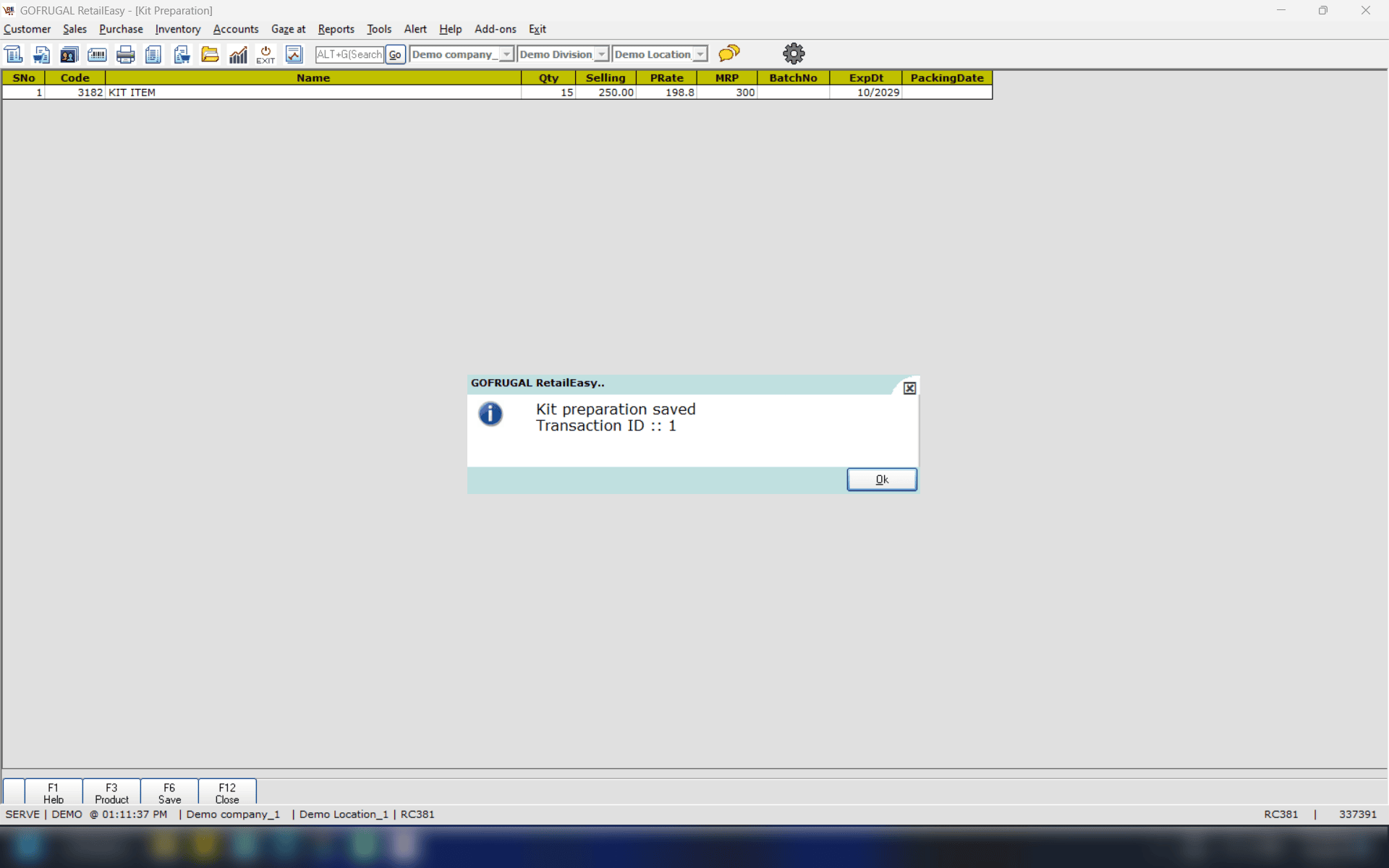 At the time of sales, you will be able to see the stock count after preparing the Kit items. Also, in the Kit preparation details (324) report, you will get the entire details.