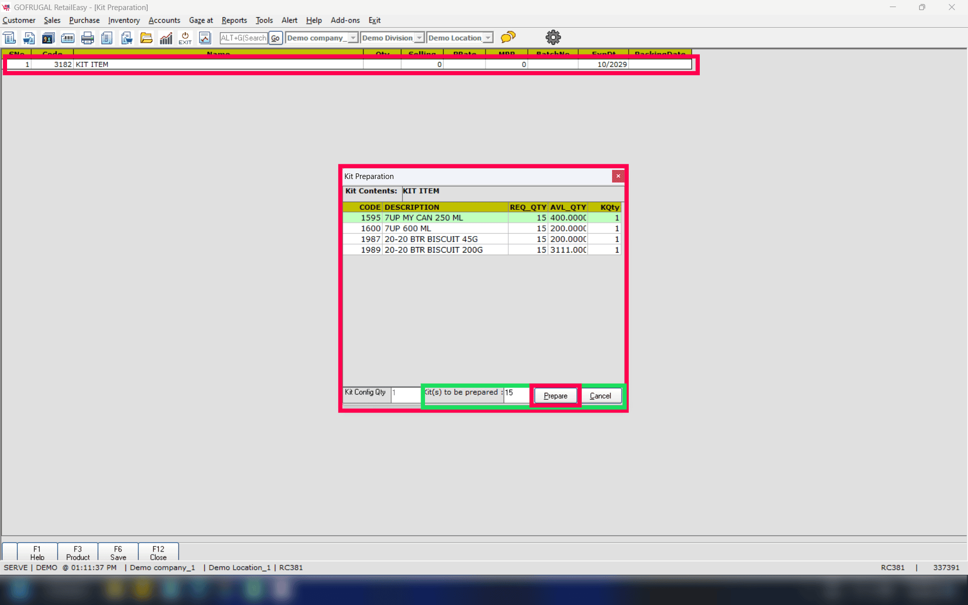 Step 2: Select the item from the list and then put the "Kits to be prepared" count and click on the prepare button.