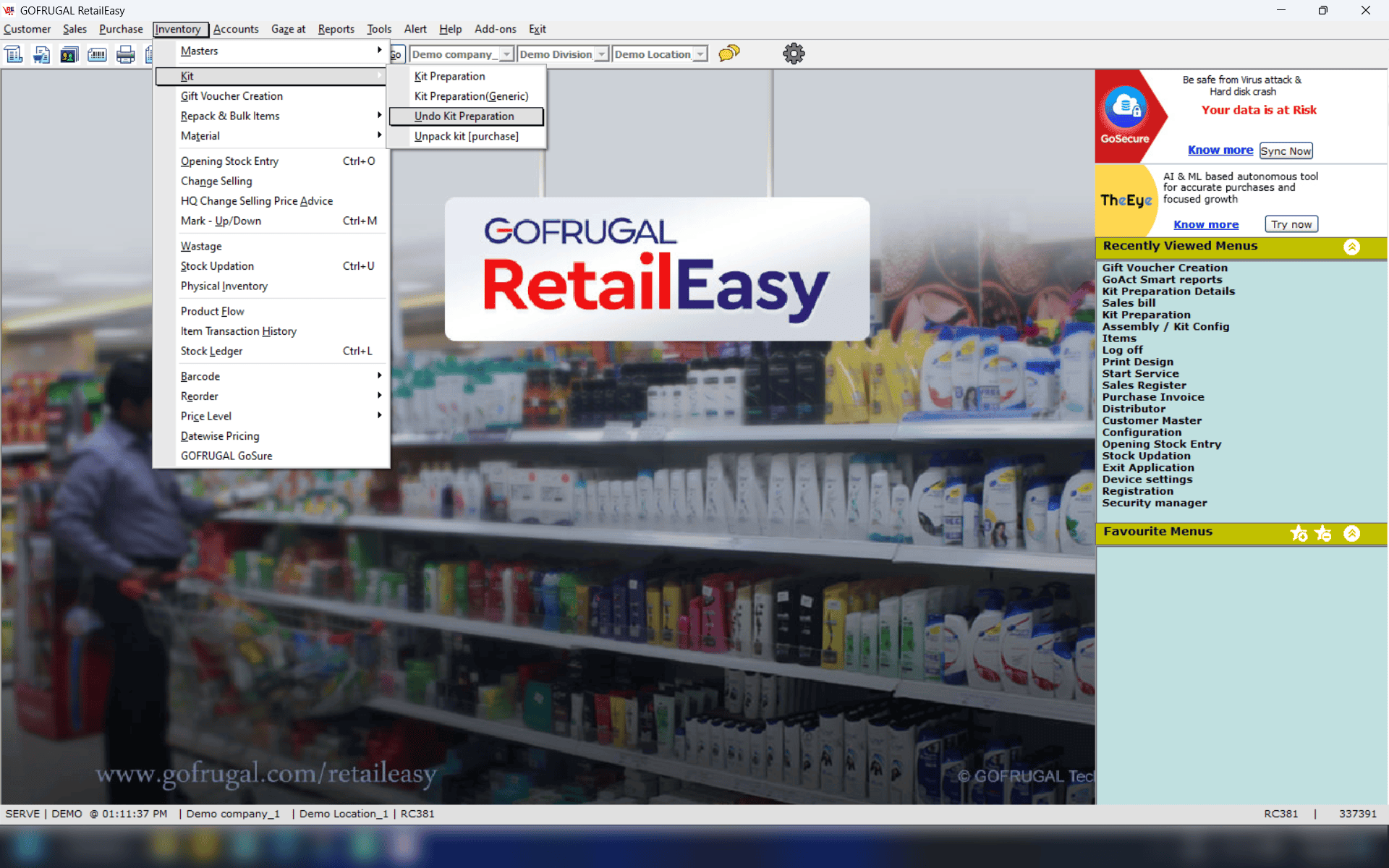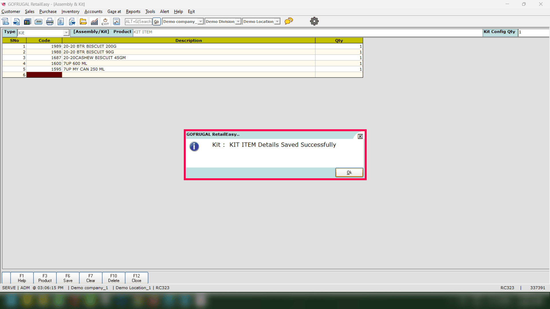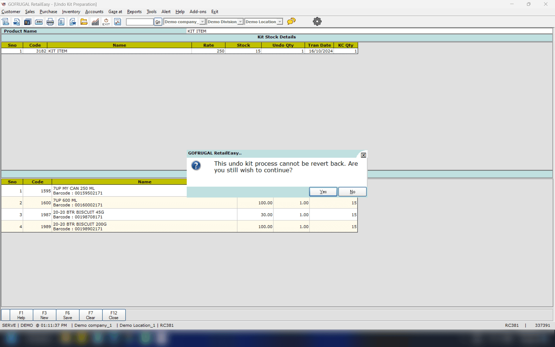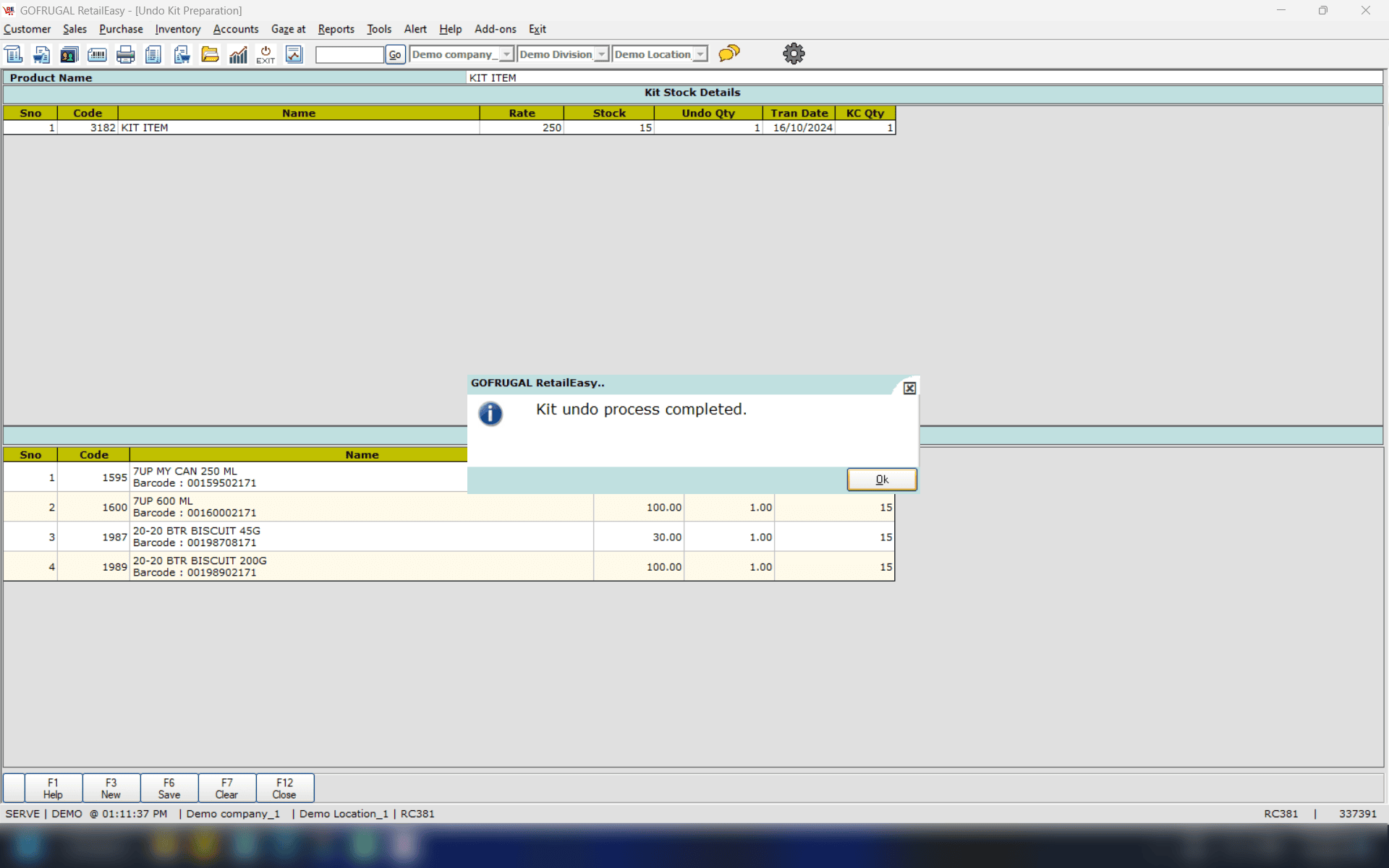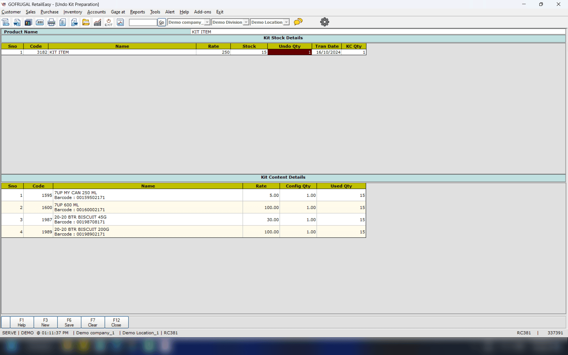 The Undo Kit Preparation screen serves the purpose of reversing or undoing the Kit item that has been prepared. For instance, if you have assembled a Dry Fruit Gift pack (Kit item) containing various items such as Almonds, Hazelnuts, Cashew nuts, Walnuts, and others for the Diwali festival, you may wish to disassemble the gift pack and sell the individual items once the festival has concluded. This process facilitates that transition effectively.