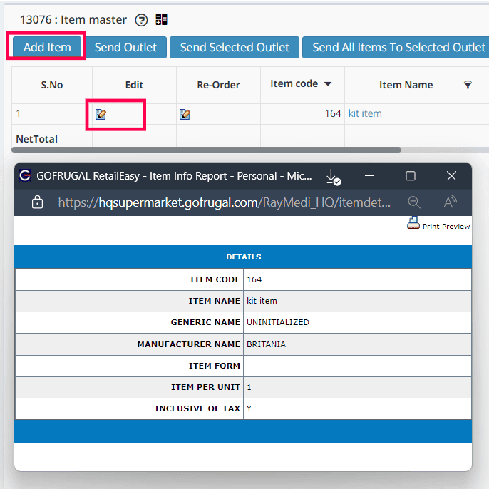Step 2: Click on the Edit button to edit the item or click on Add Item to add a new item.