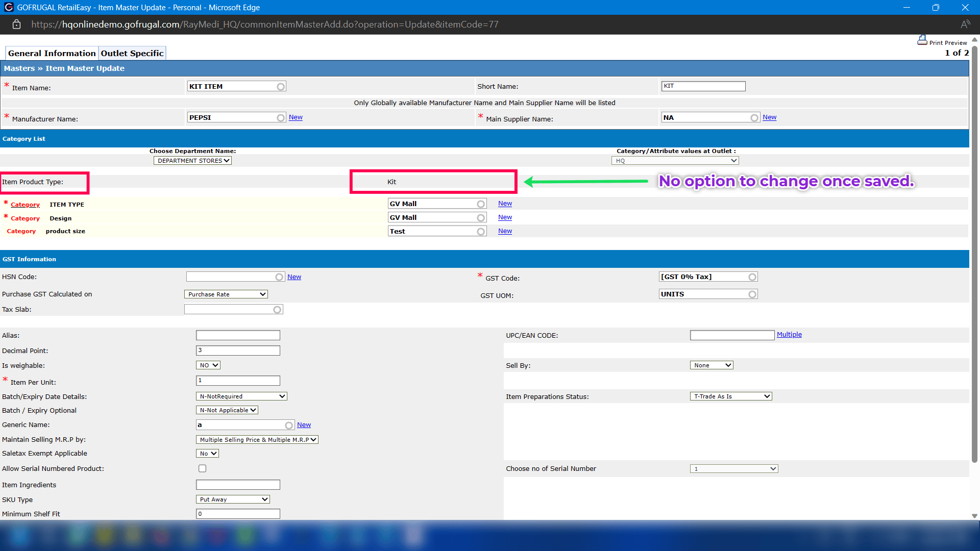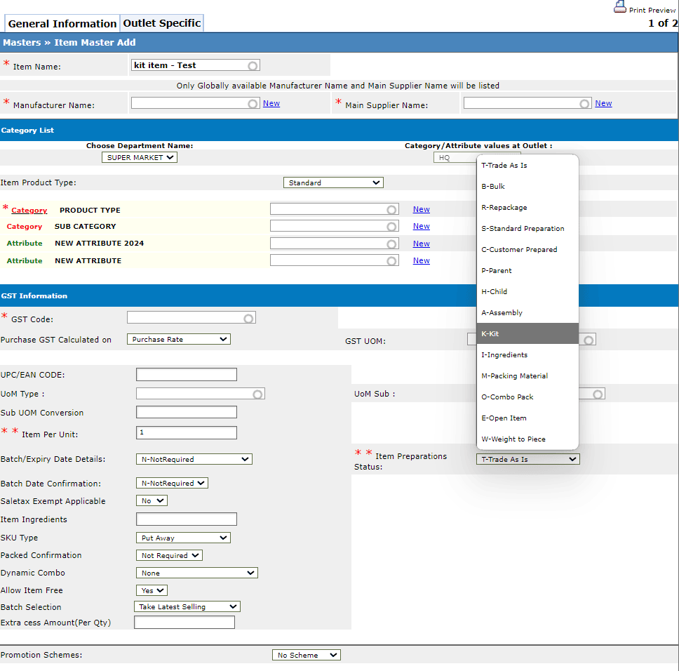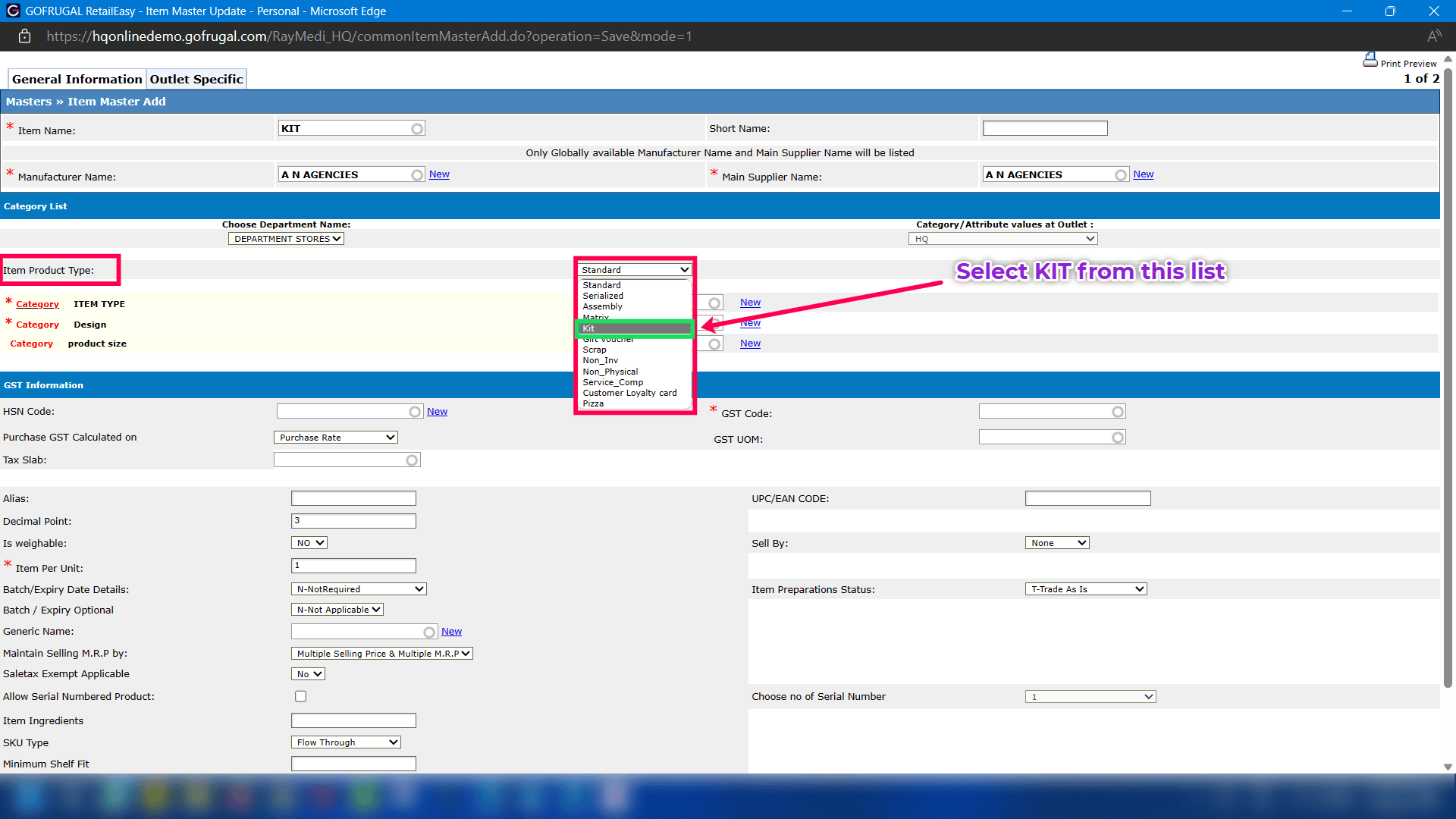 Step 3: Locate Item Product Type and select KIT from the list.