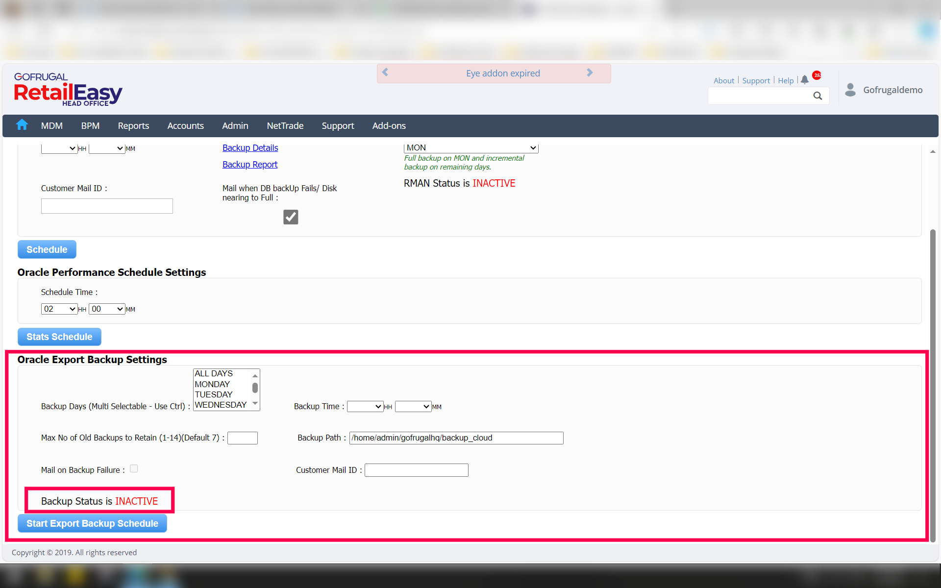 Step 2: It has 3 sections, Oracle Backup Settings, Oracle Performance Schedule Settings, and Oracle Export Backup Settings. You can do the setup as per your need.