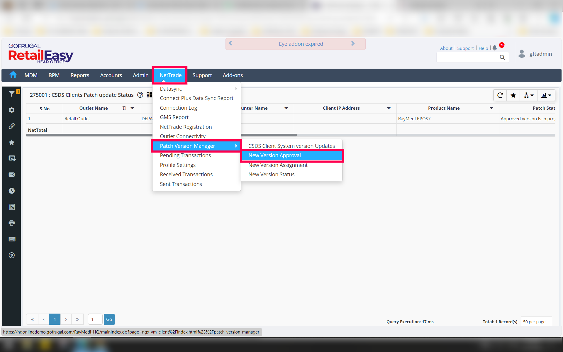 In the New Version Approval screen, we can check the latest patch to be applied in the Outlet Server and Client systems.