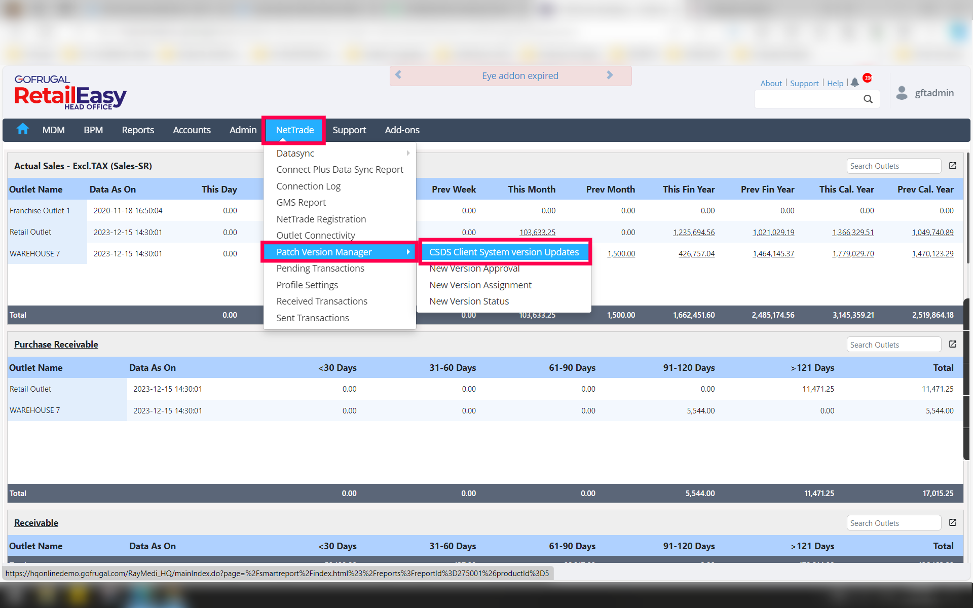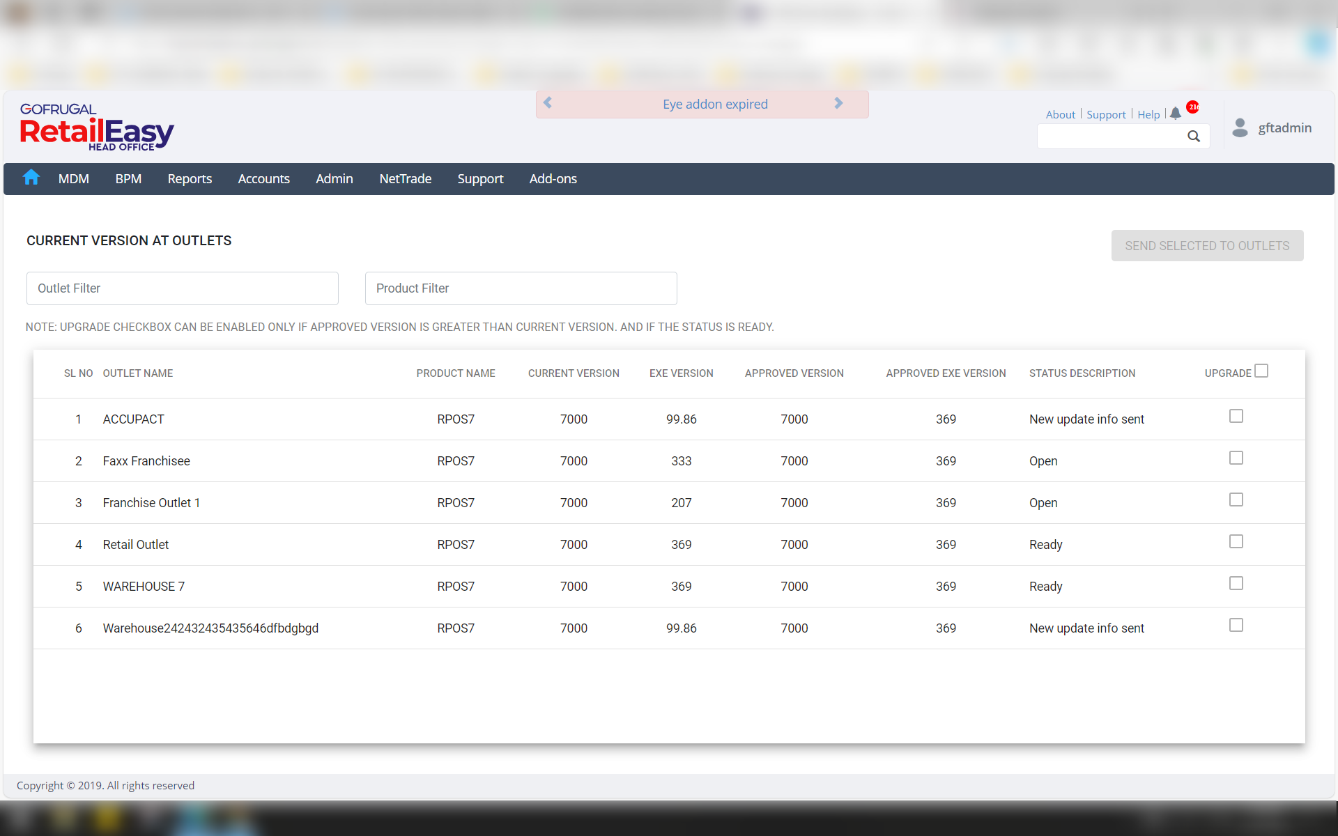 Put a Tick Mark ☑ in the Upgrade check box and click on SEND SELECTED OUTLETS. This is used to update the outlets based on their availability.