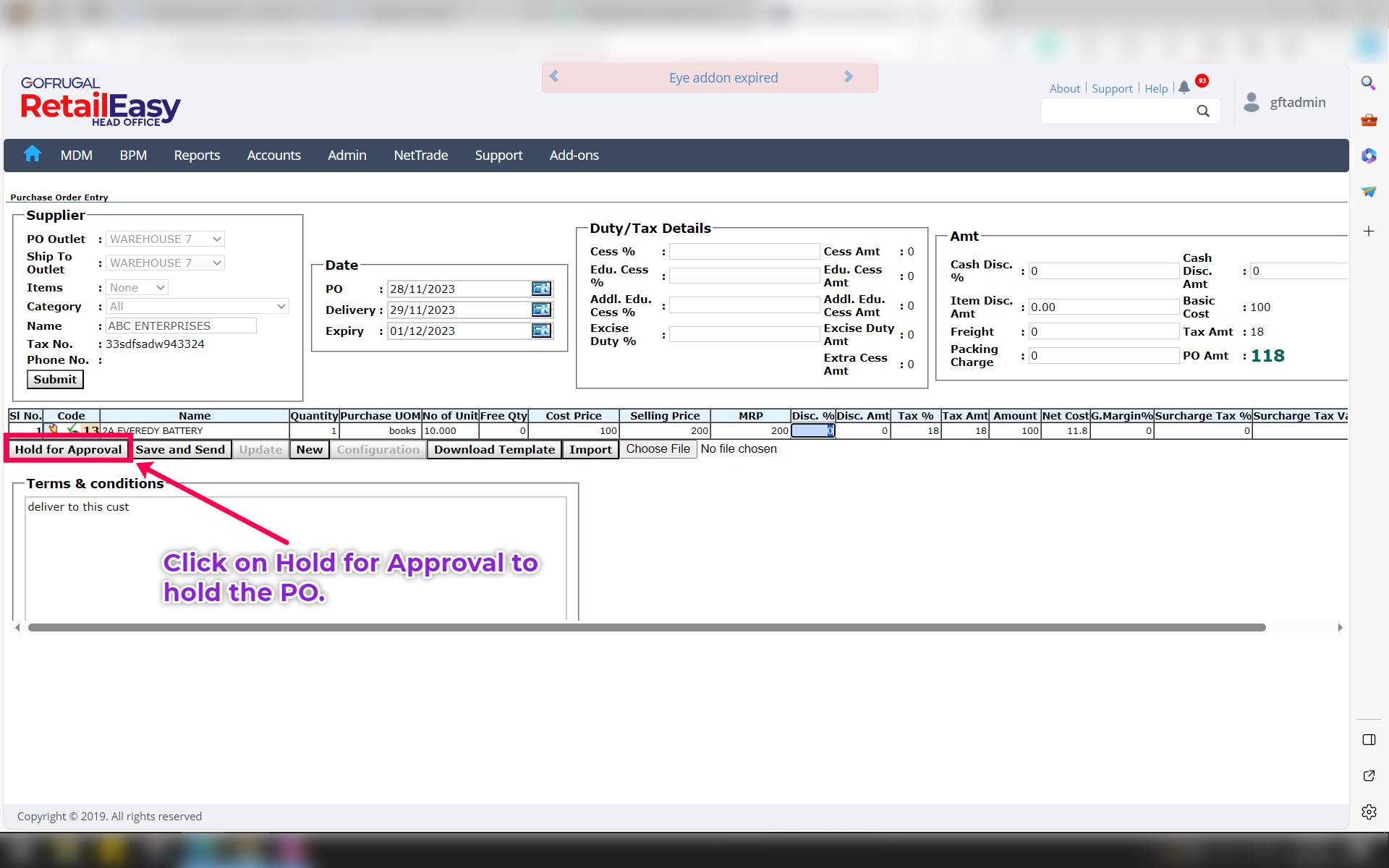 Step 1: After loading all the desired items, click on the "Hold for Approval" button to hold the PO. The PO will be saved and sent for approval in the Central Purchase Approval Screen.