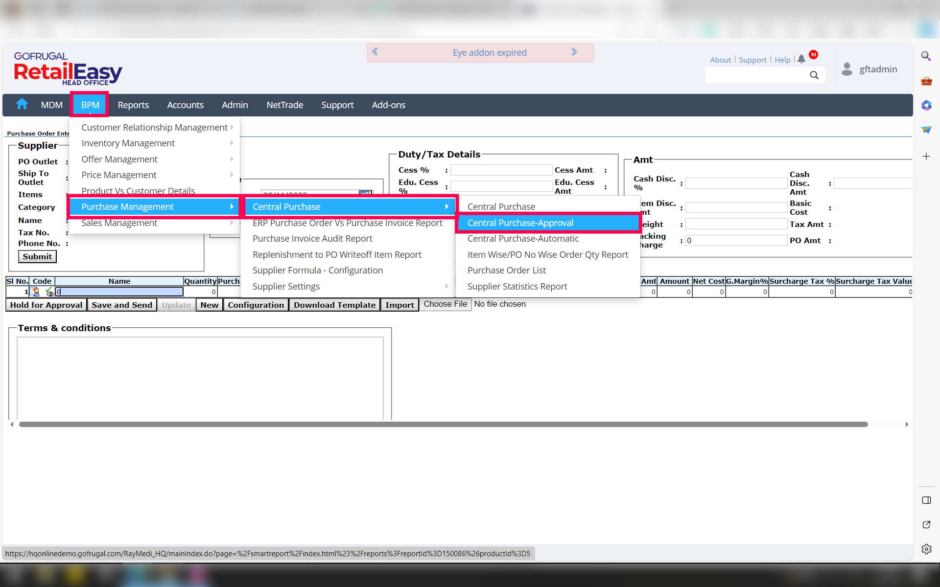 Step 2: Then go to BPM > Purchase Management > Central Purchase > Central Purchase Approval