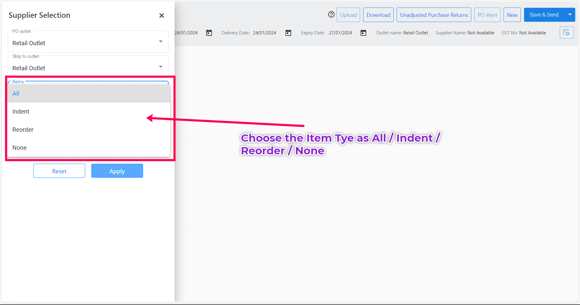 Step 3: Choose the Item Type as All / Indent / Reorder / None.