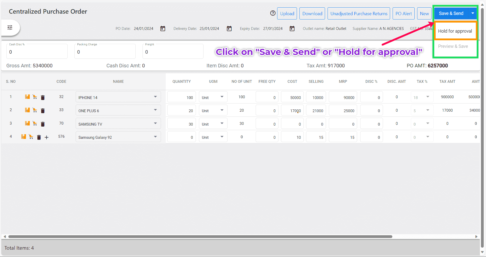 ***Note: If you click on the "Hold for approval" button, you need to approve it from the Central Purchase - Approval screen.