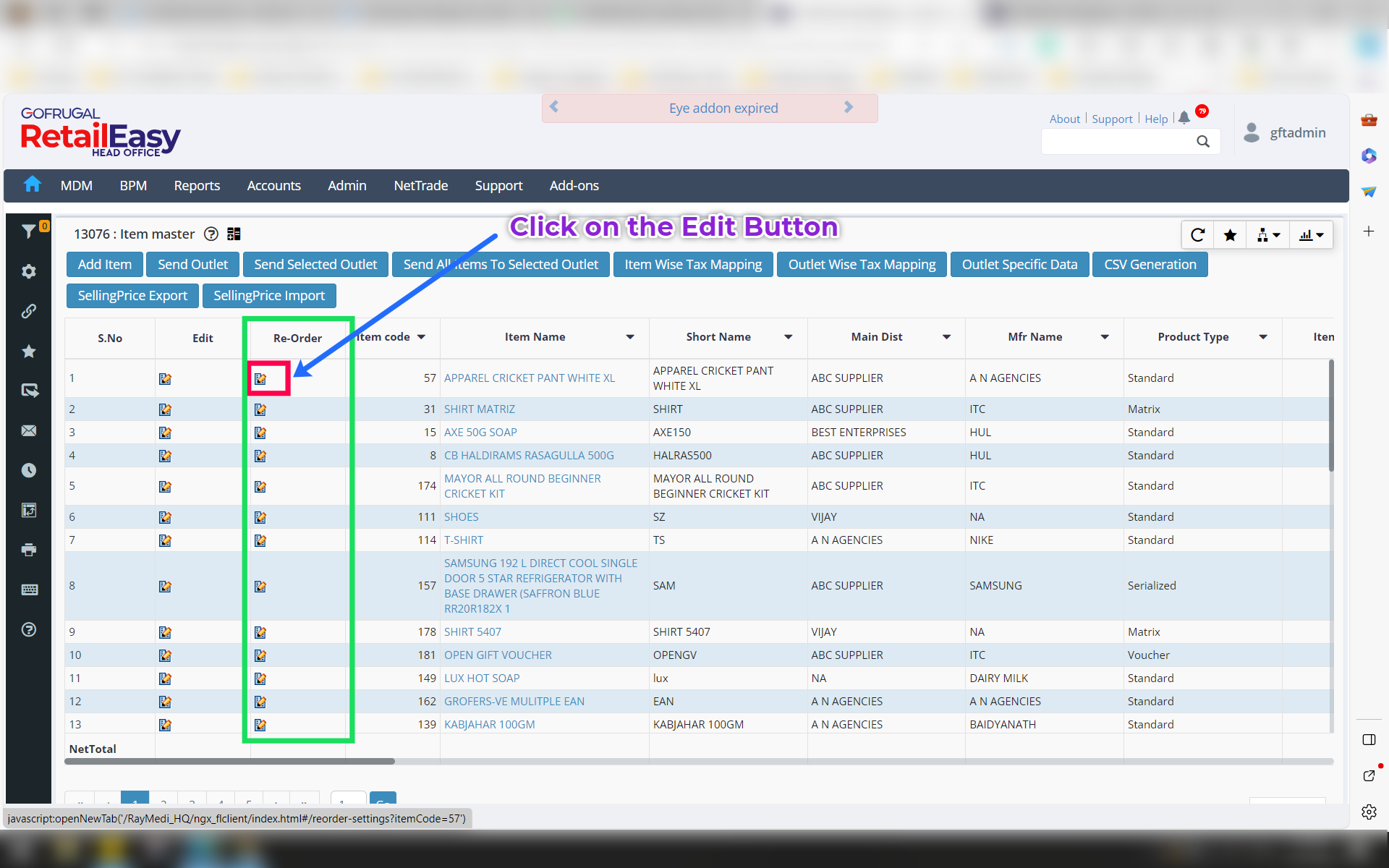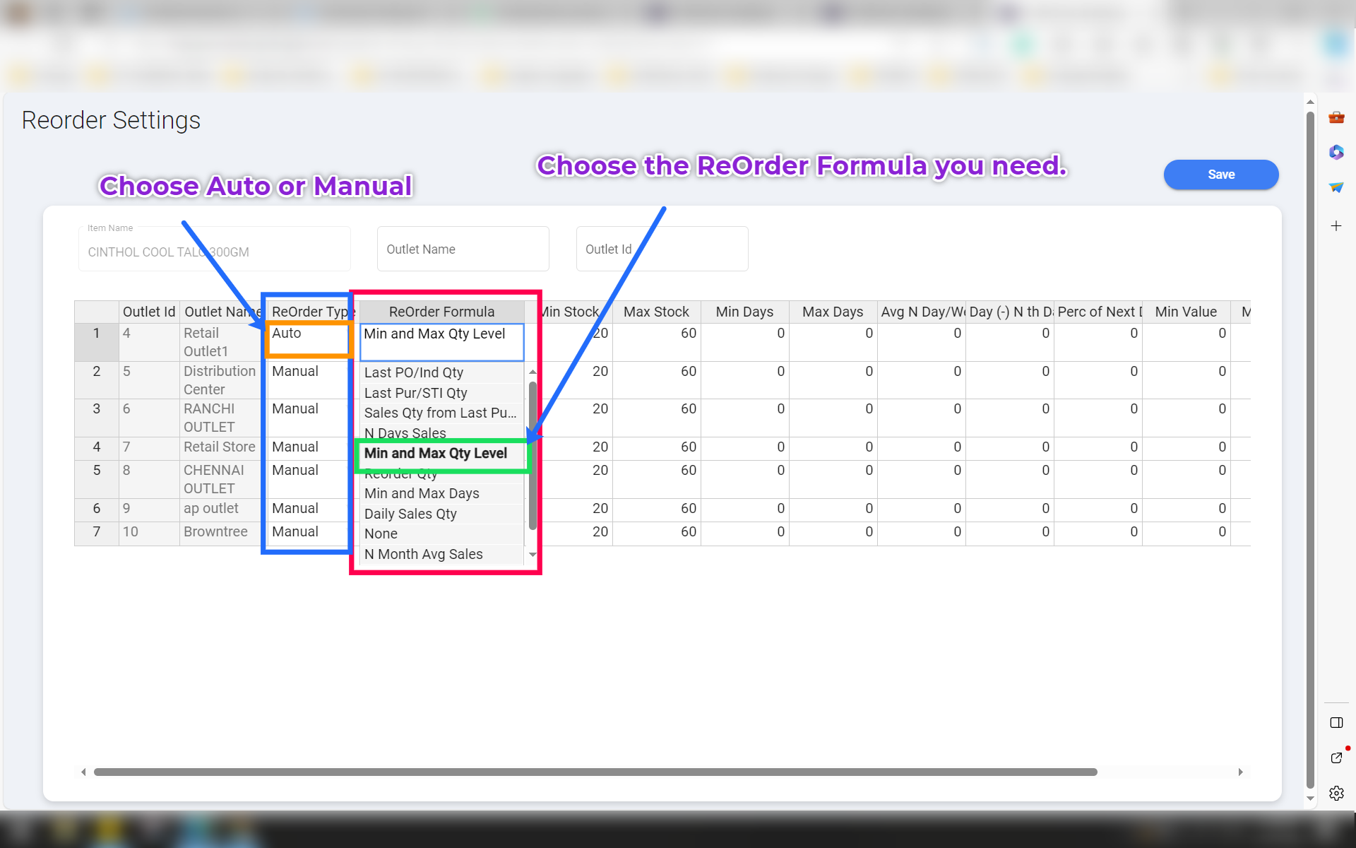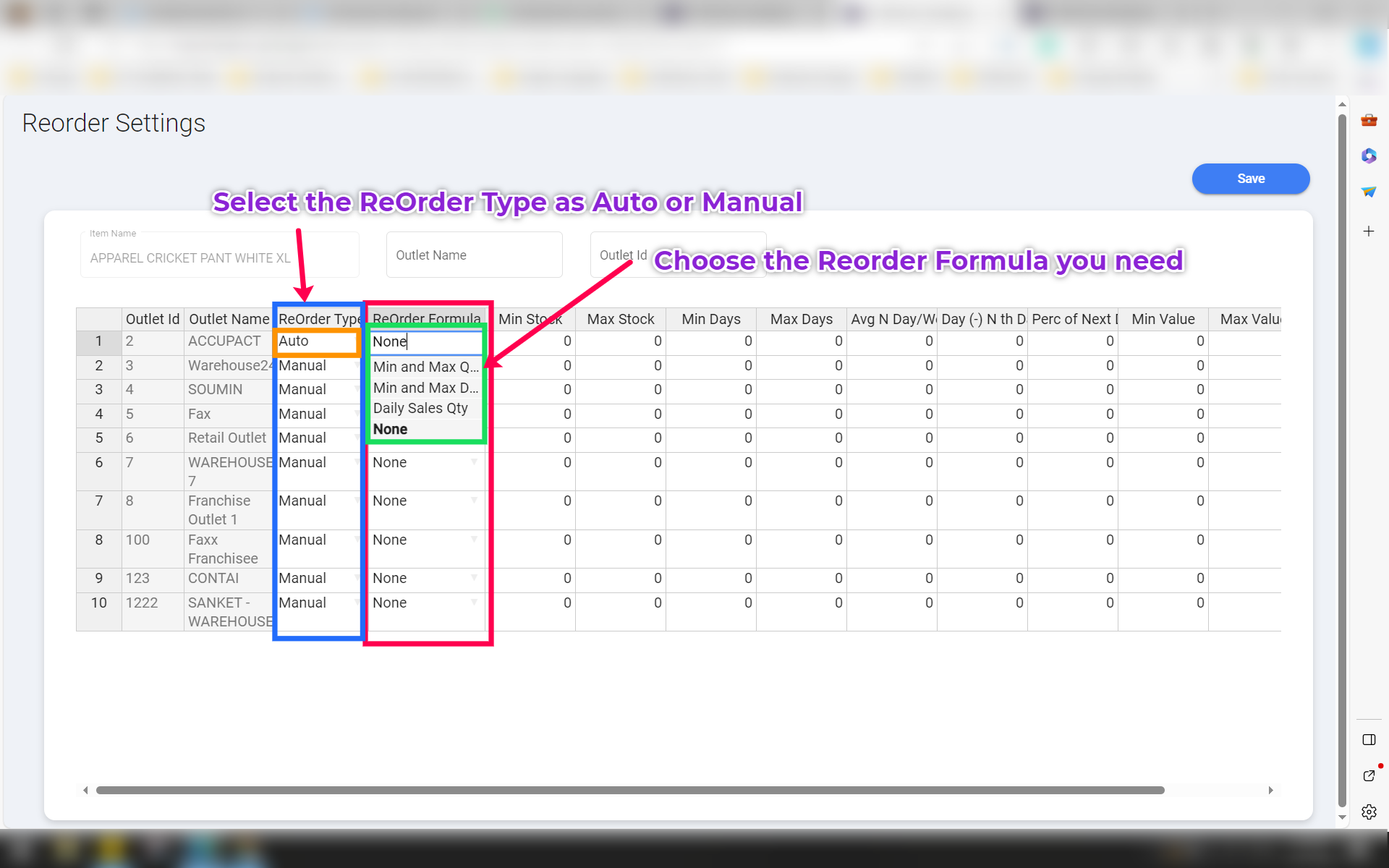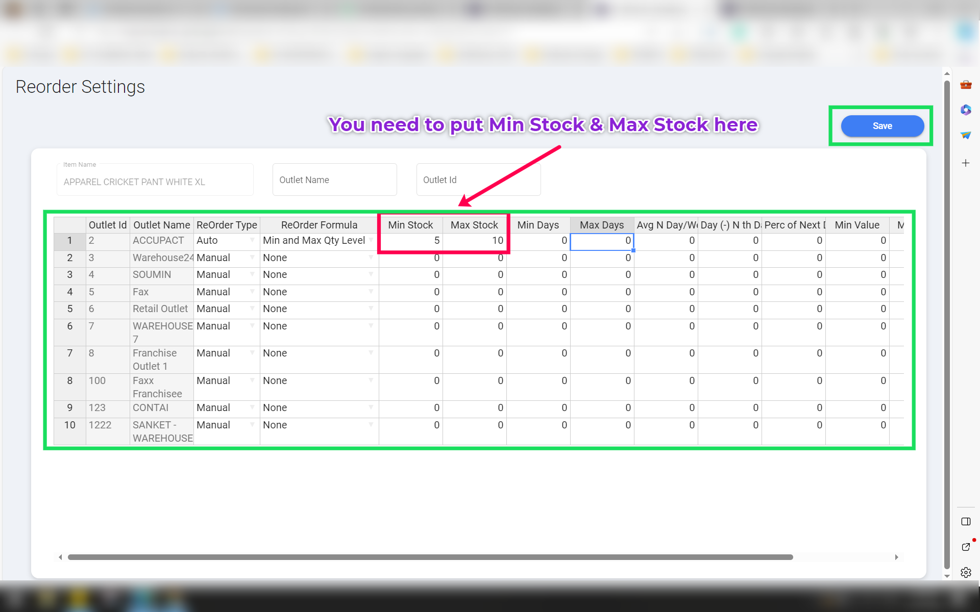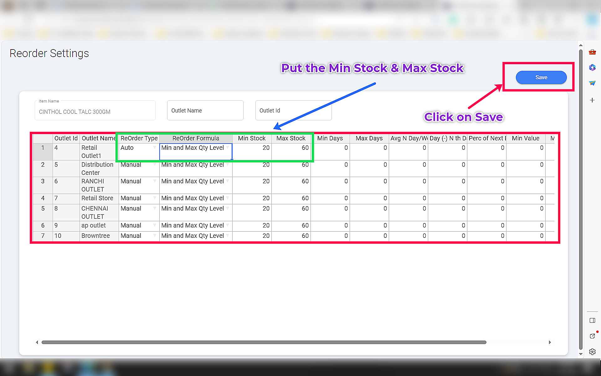 Step 4: Put the Mix Stock and Max Stock you desire outlet-wise and click on the Save button to apply the settings. There are many other options like Min Days, Max Days, etc which you can apply as per need.