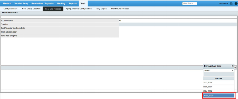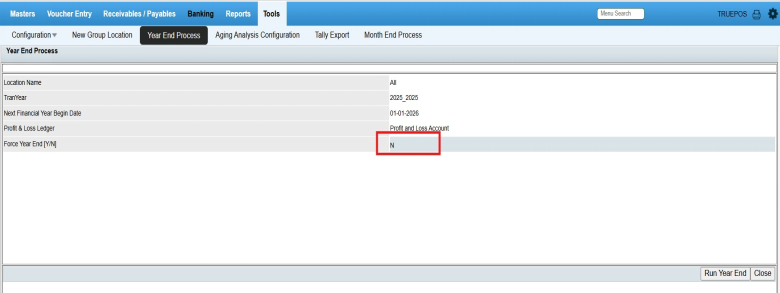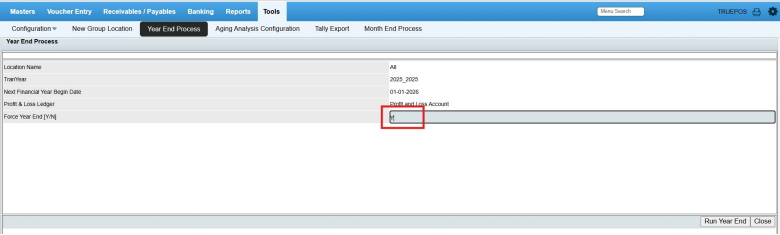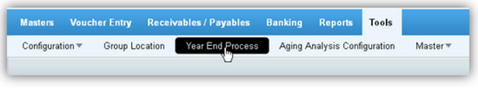 Menu Access: In Finance and Accounts, click Tools --> Year End Process.