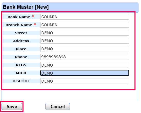 Complete all the fields with your Bank Name, Branch Name, Street, Address, Place, Phone, RTGS, MICR, and IFSCODE, and press Save.