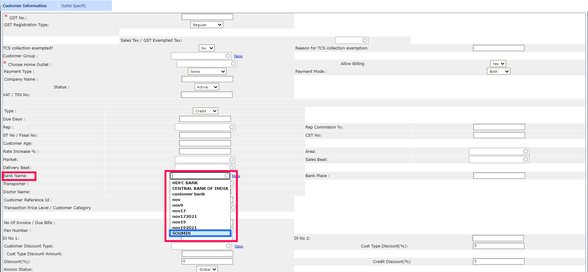 Note: When setting up the customer master, you'll have the option to select the newly created bank name from the available list. Please refer to the screenshot below for guidance.