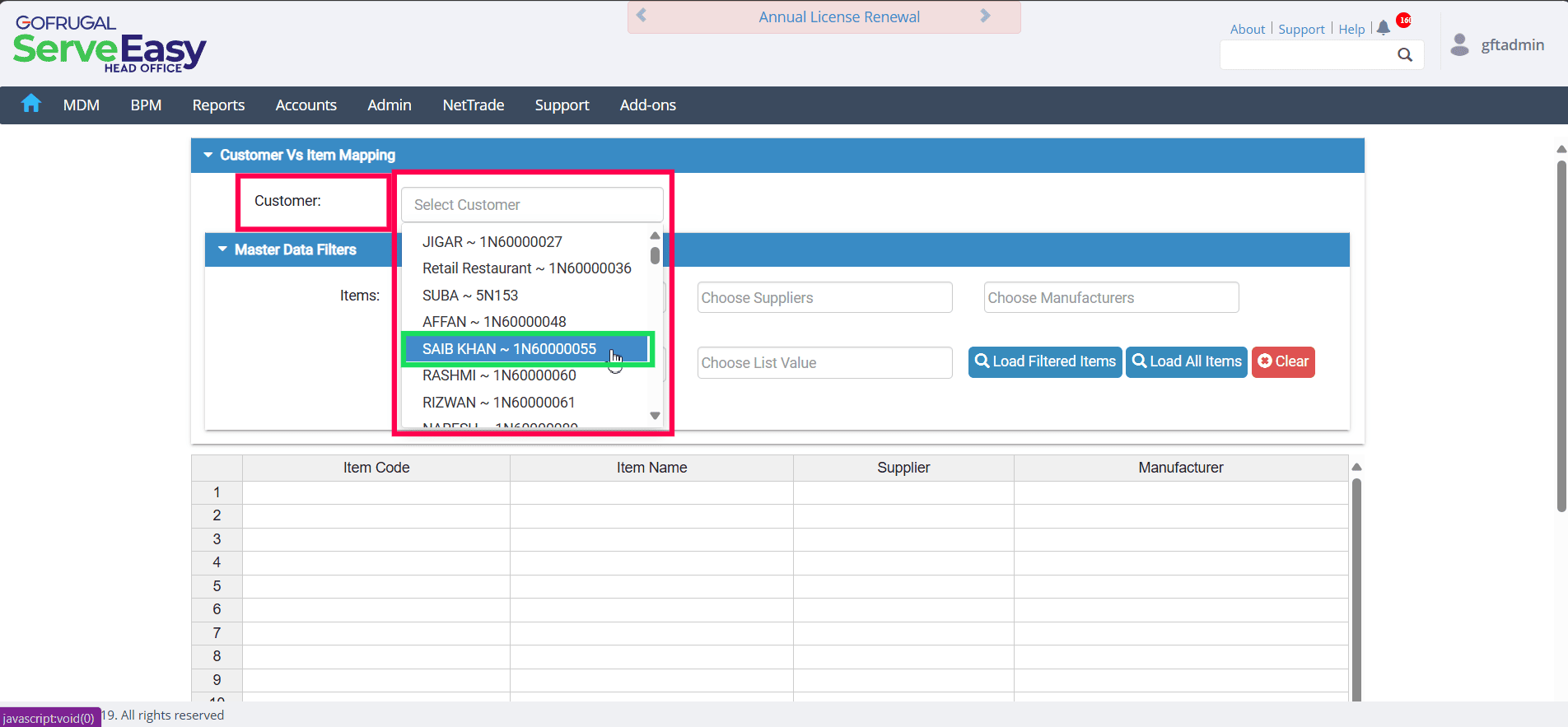 Under the Customer Vs Item Mapping, first we need to select the customer name from the customer list.