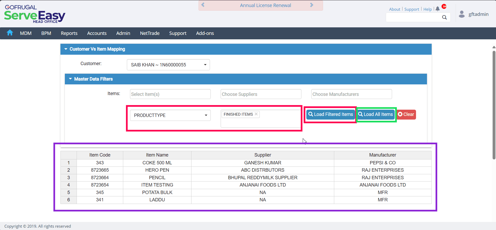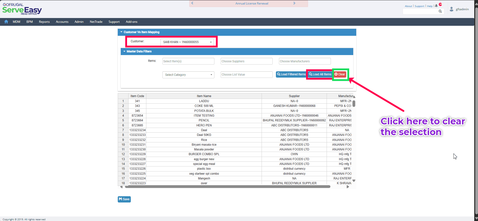 If you want to load all the items irrespective of any filters, click on the Load All Items button. If you want to clear the selection/reset the screen, click on the red-colored Clear button.