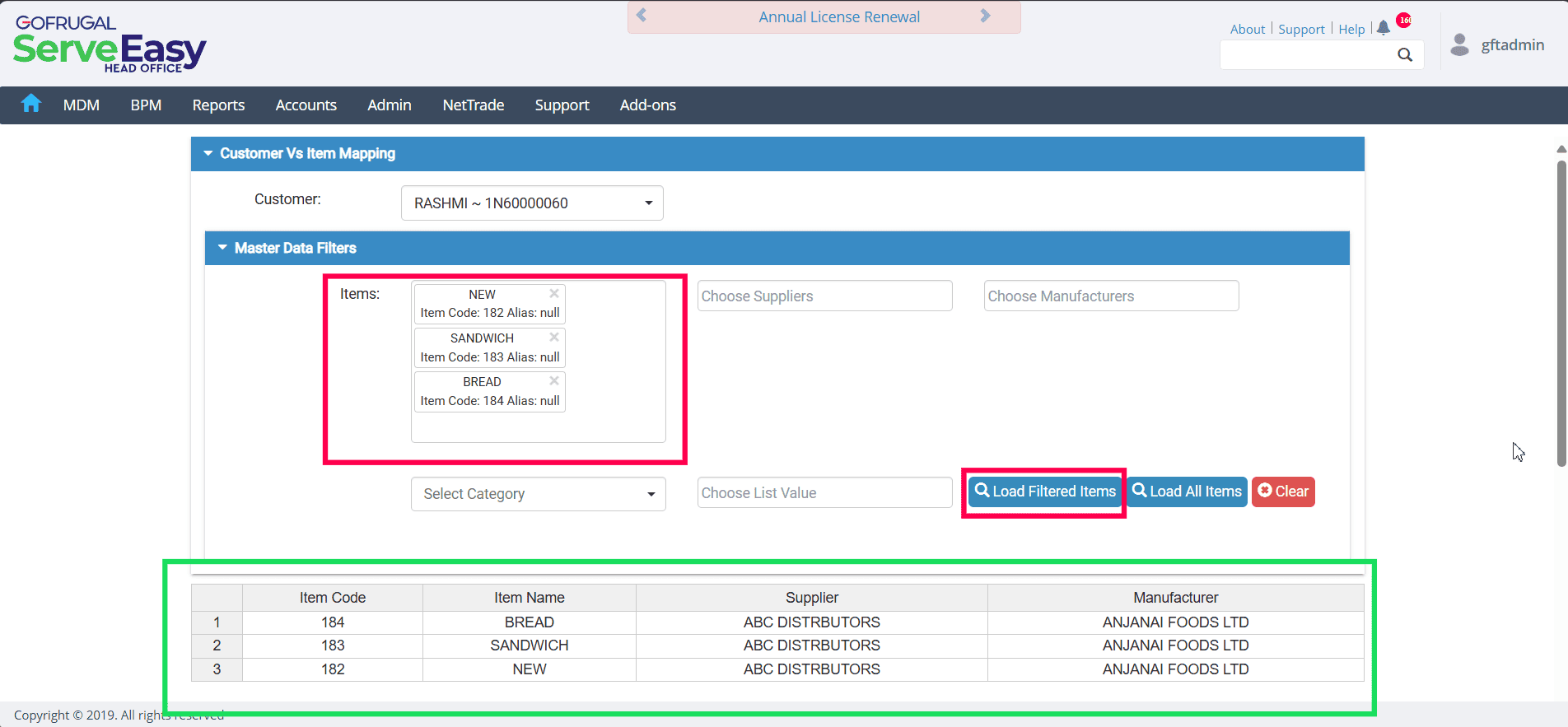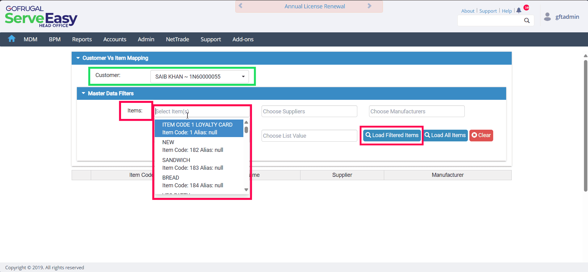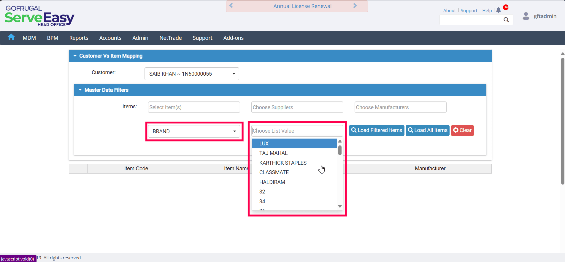 To filter Manufacturers, select the manufacturer name from the list and click on the Load Filtered Items button. Based on the manufacturer mapped in the item master, the items will be loaded.
