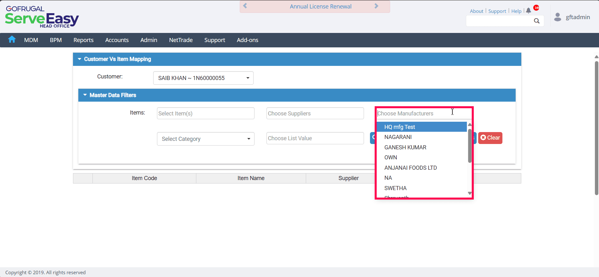 Navigate to MDM > Item Master Management > Customer Vs Item mapping
