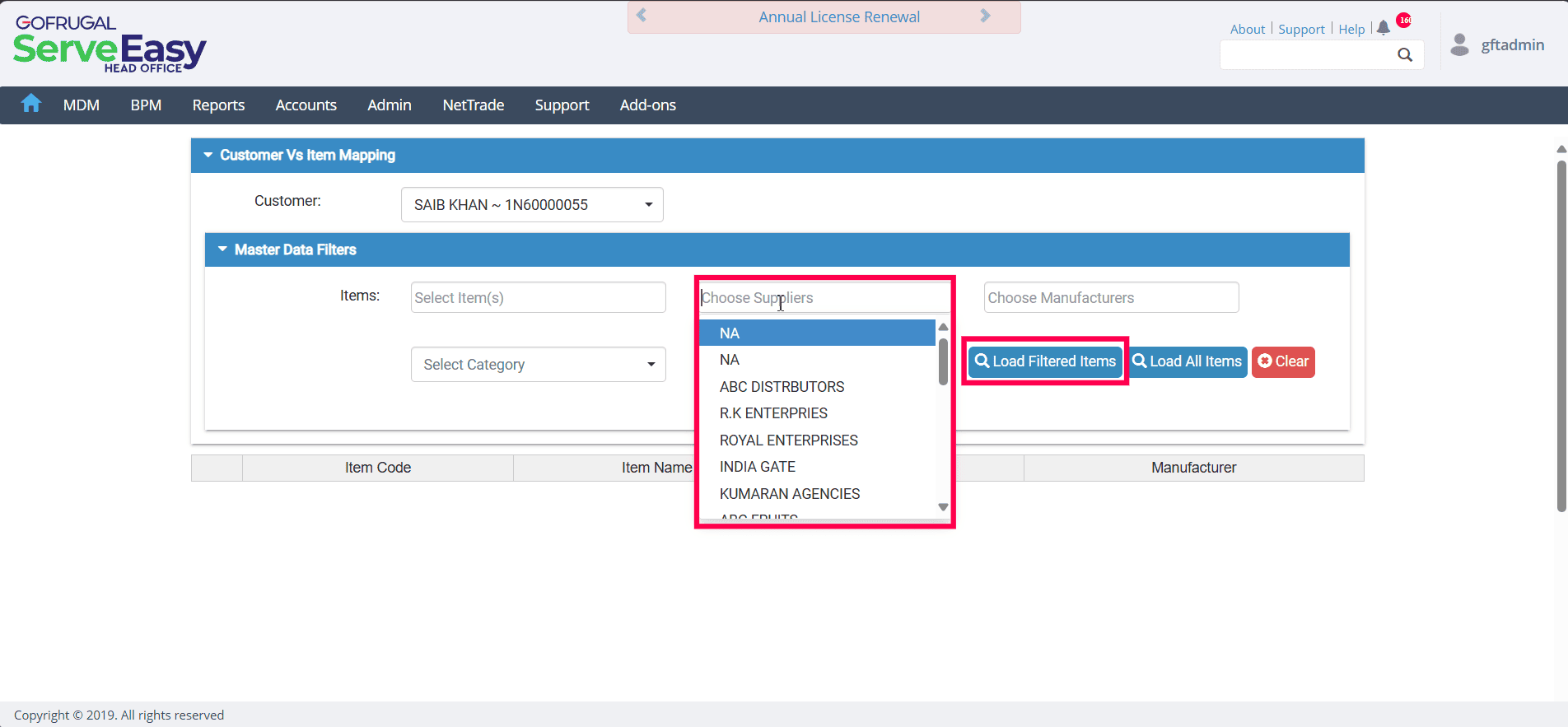 To filter Suppliers, select the supplier name from the list and click on the Load Filtered Items button. Based on the suppliers mapped in the item master, the items will be loaded.