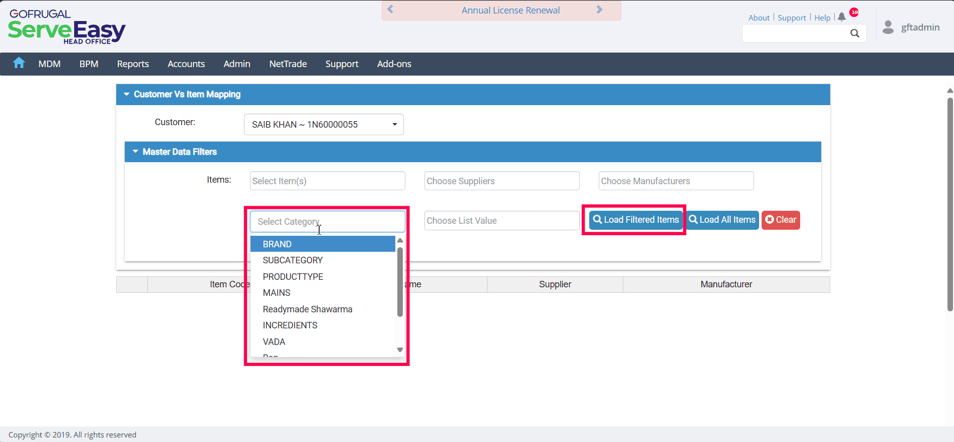 To filter Categories, select the category name from the list and click on the Load Filtered Items button. Based on the manufacturer mapped in the item master, the items will be loaded.