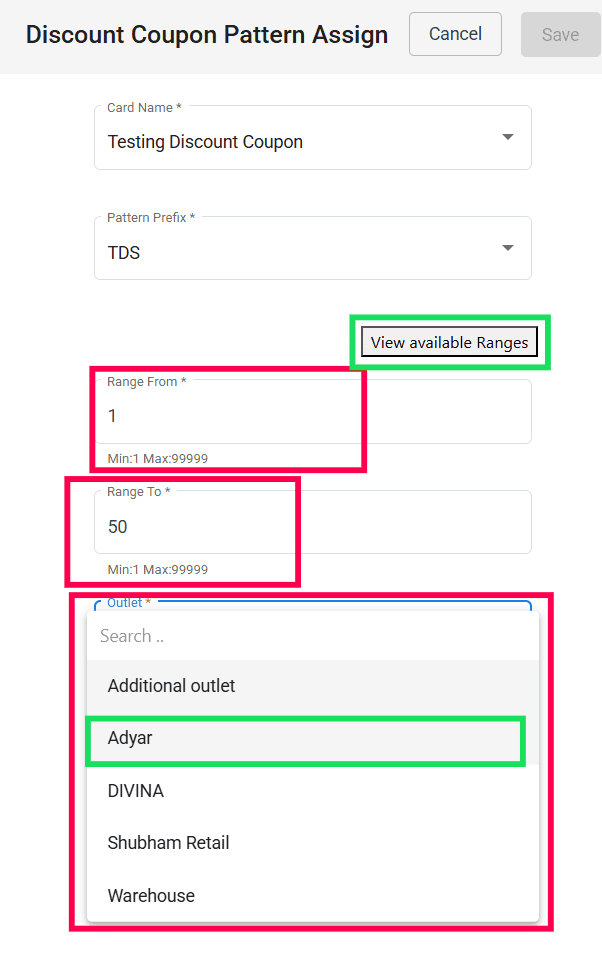 In the Outlet field, select the outlet to which you want to assign the discount coupon range.