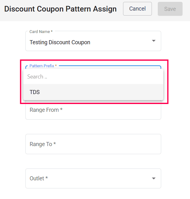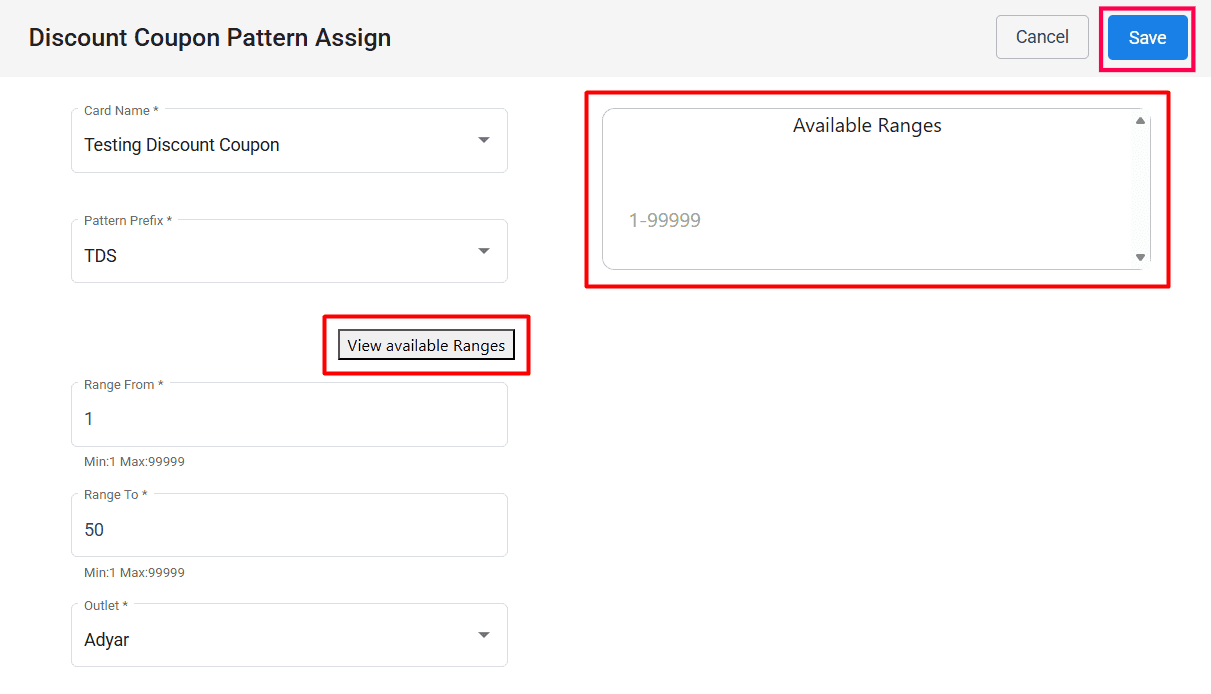 Click the Save button to assign the discount coupon pattern to the selected outlet.