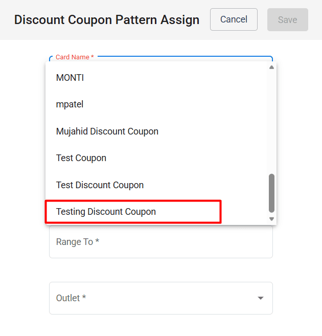 Click on the field to open the list of available Discount Coupon Masters, then select the required Card Name / Discount Coupon Name from the list.