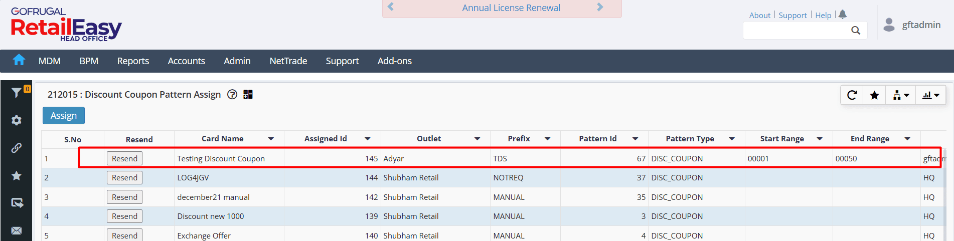Click the Assign button to begin assigning the Discount Coupon Pattern to the selected outlets.