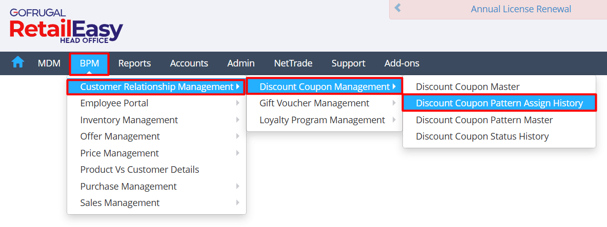 Navigate to BPM > Customer Relationship Management > Discount Coupon Management > Discount Coupon Pattern Assign History.