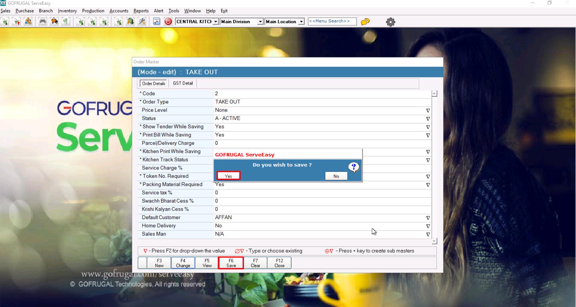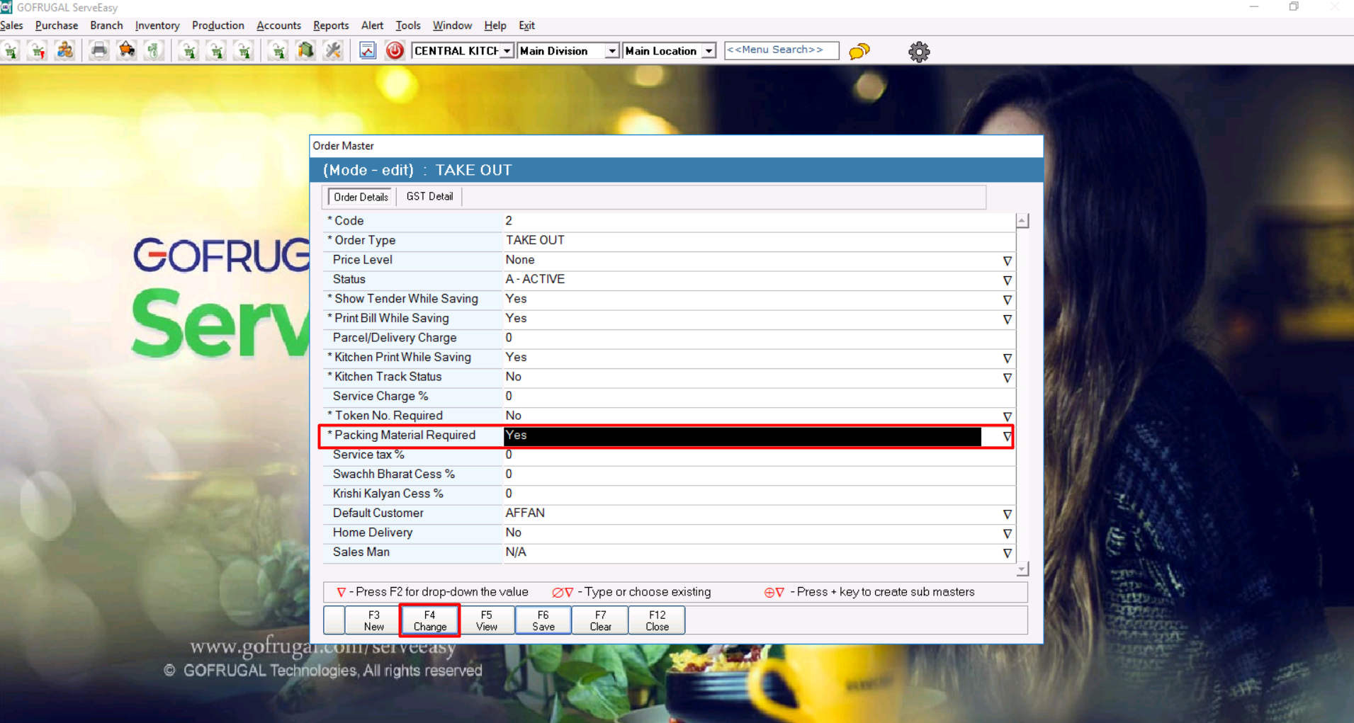 Update the Take Out order type master by enabling the Packing Master Required option to Yes.