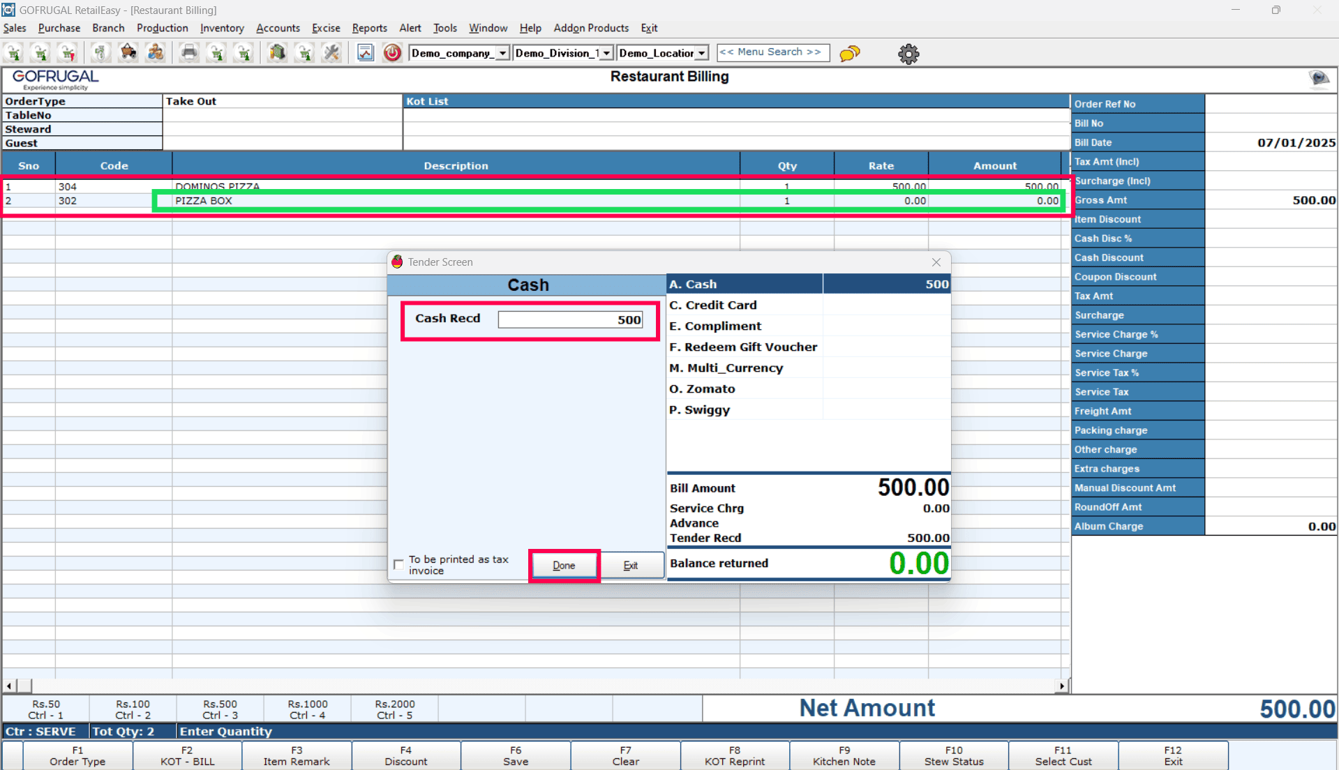 We'll set up the packing material in the Order Type Master, so whenever you use that order type, the packing material gets automatically included in the sales bill.