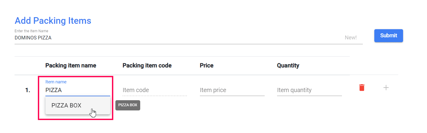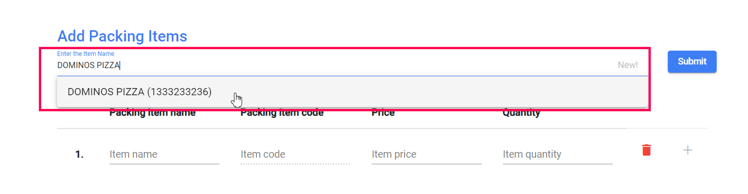 Search for and choose the name of the packing item.
