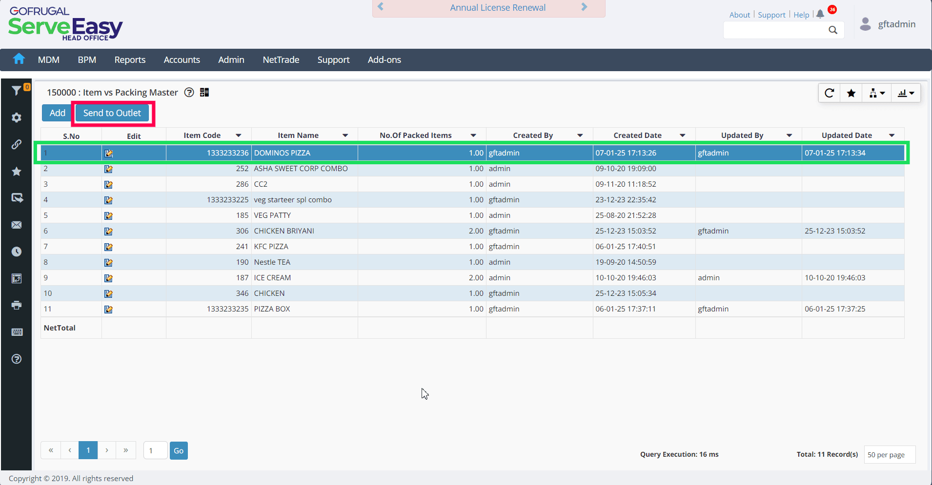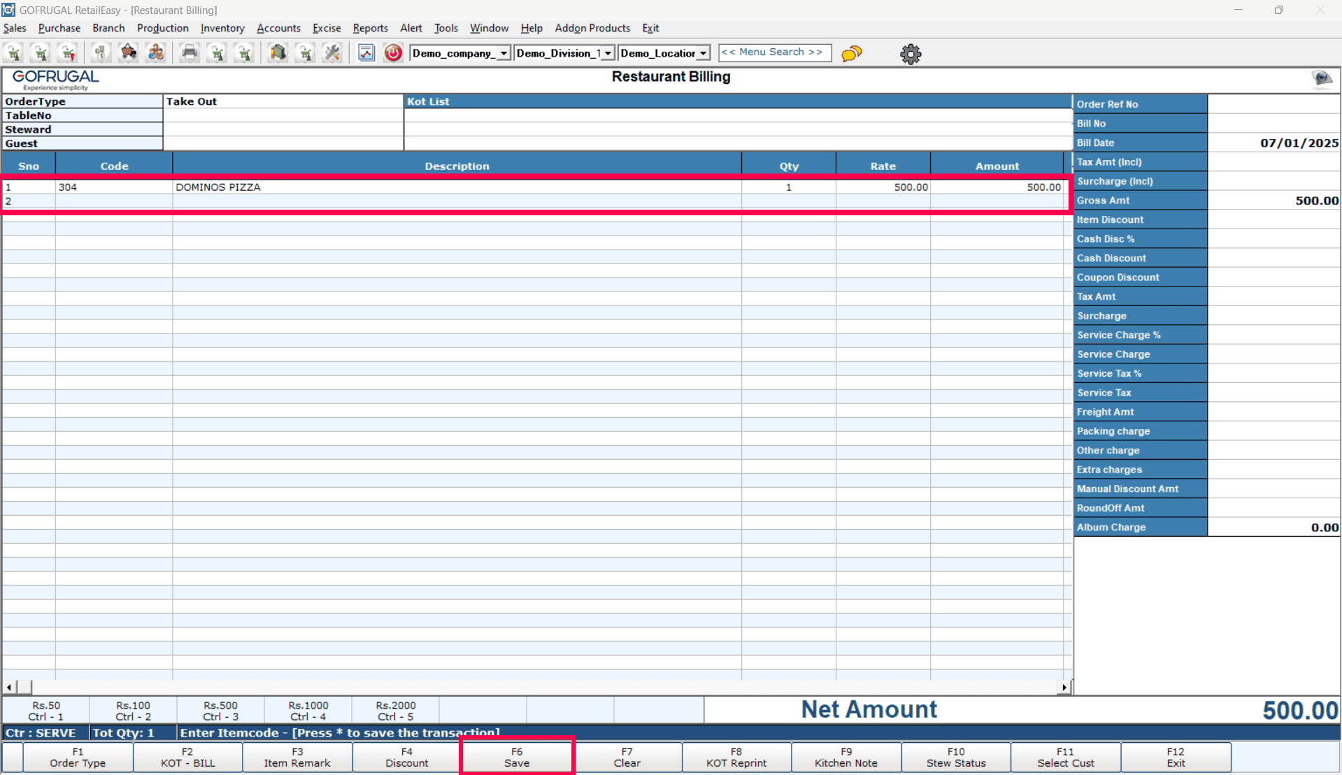 Load the DOMINOS PIZZA item by pressing Enter button, then press F6 Save button.