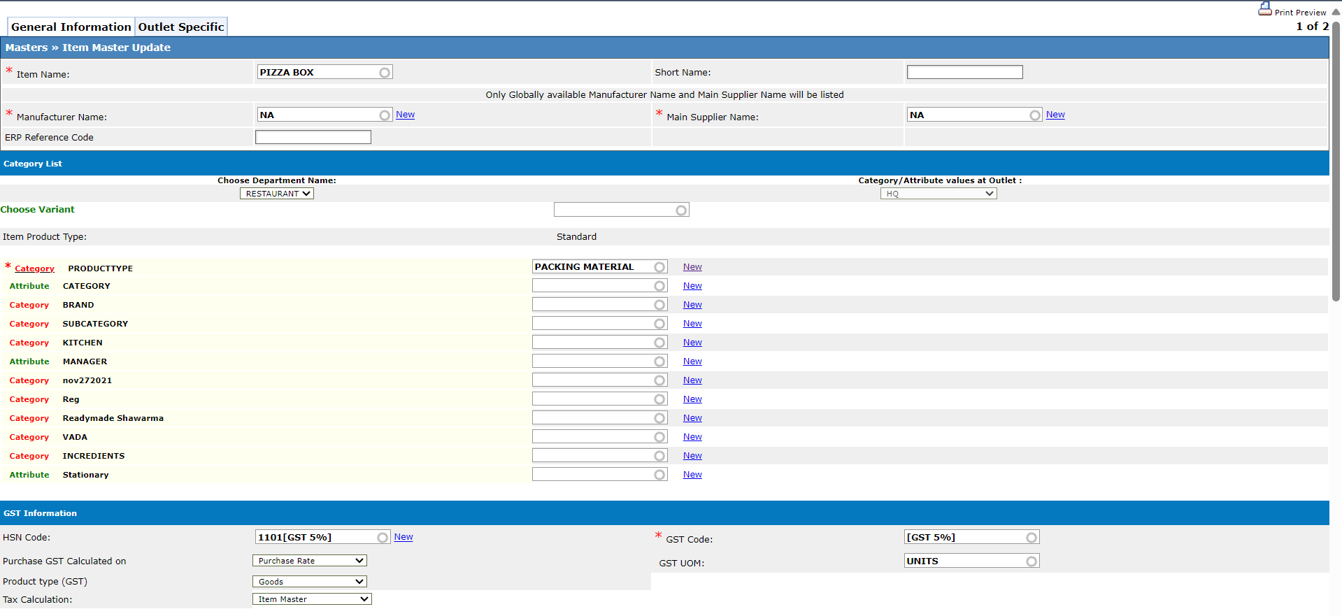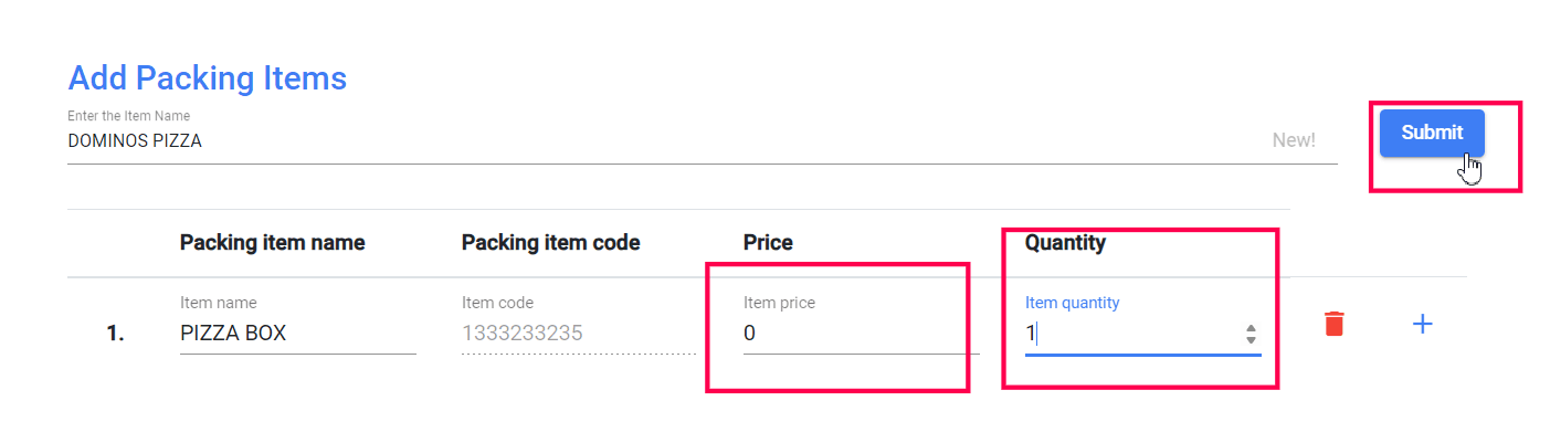 Add the item name as 'Pizza Box' and add the other details.