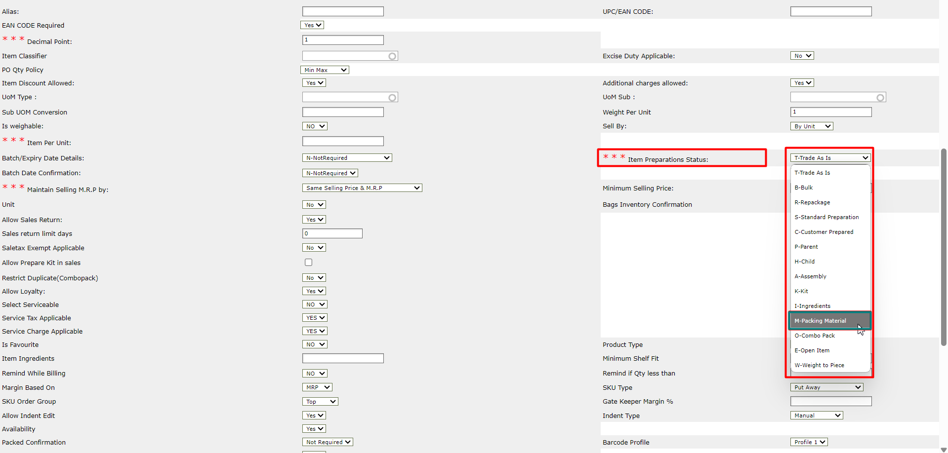 Find the Item Preparation Status field and change it to M-Packing Material. This is the key aspect of putting together the packing items.