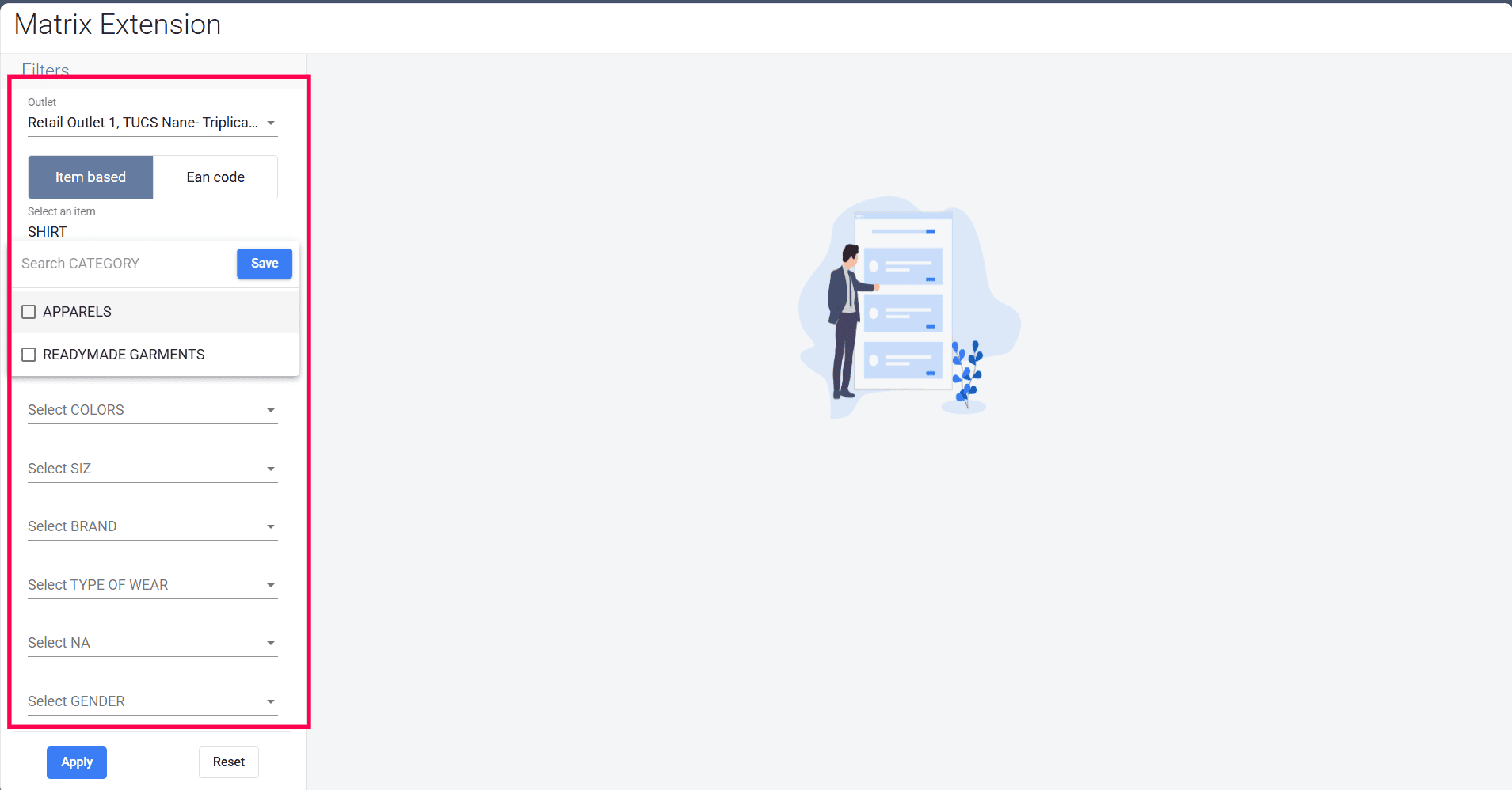After selecting the item, choose the required categories to filter and view the specific matrix combinations.