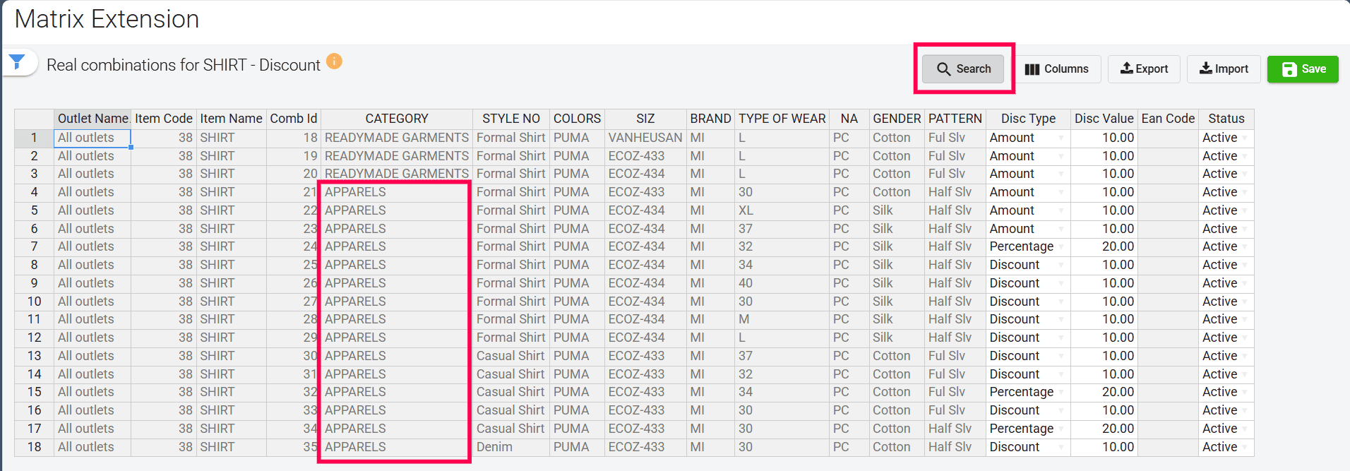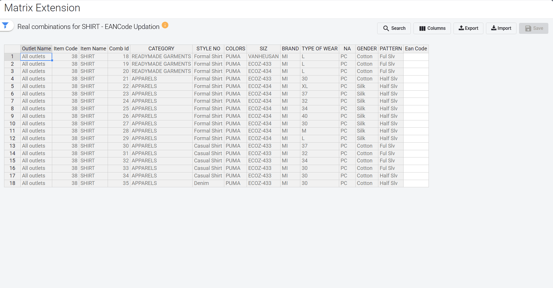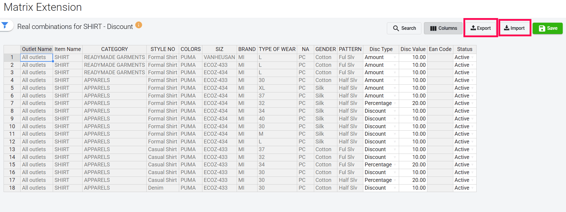 Additionally, this screen provides options to import and export data directly, enabling bulk updates and efficient data management for matrix item combinations.