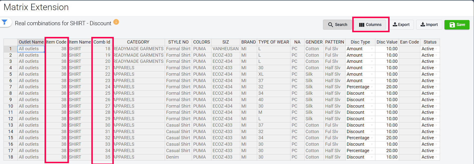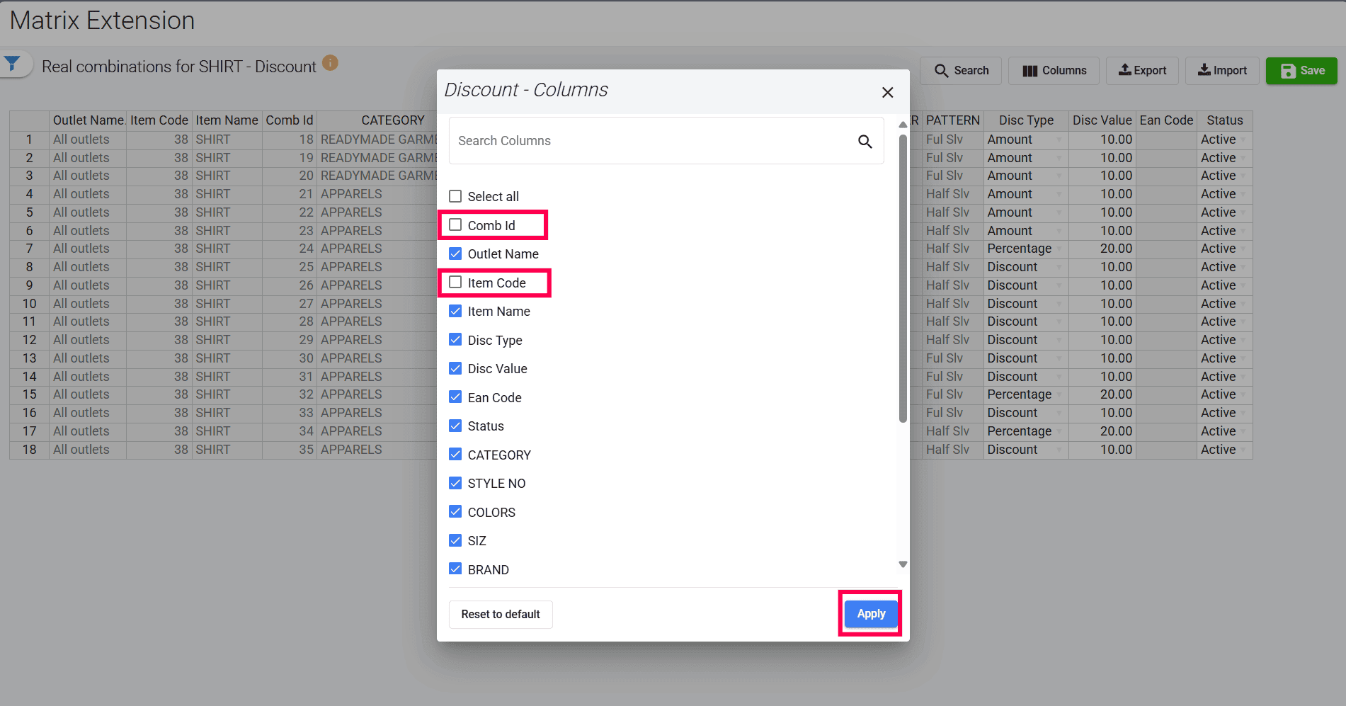 Click the Columns option to view and manage the list of available columns. Notice that the Item Code and Comb ID columns are currently active, indicating that they are enabled and visible on the screen.
