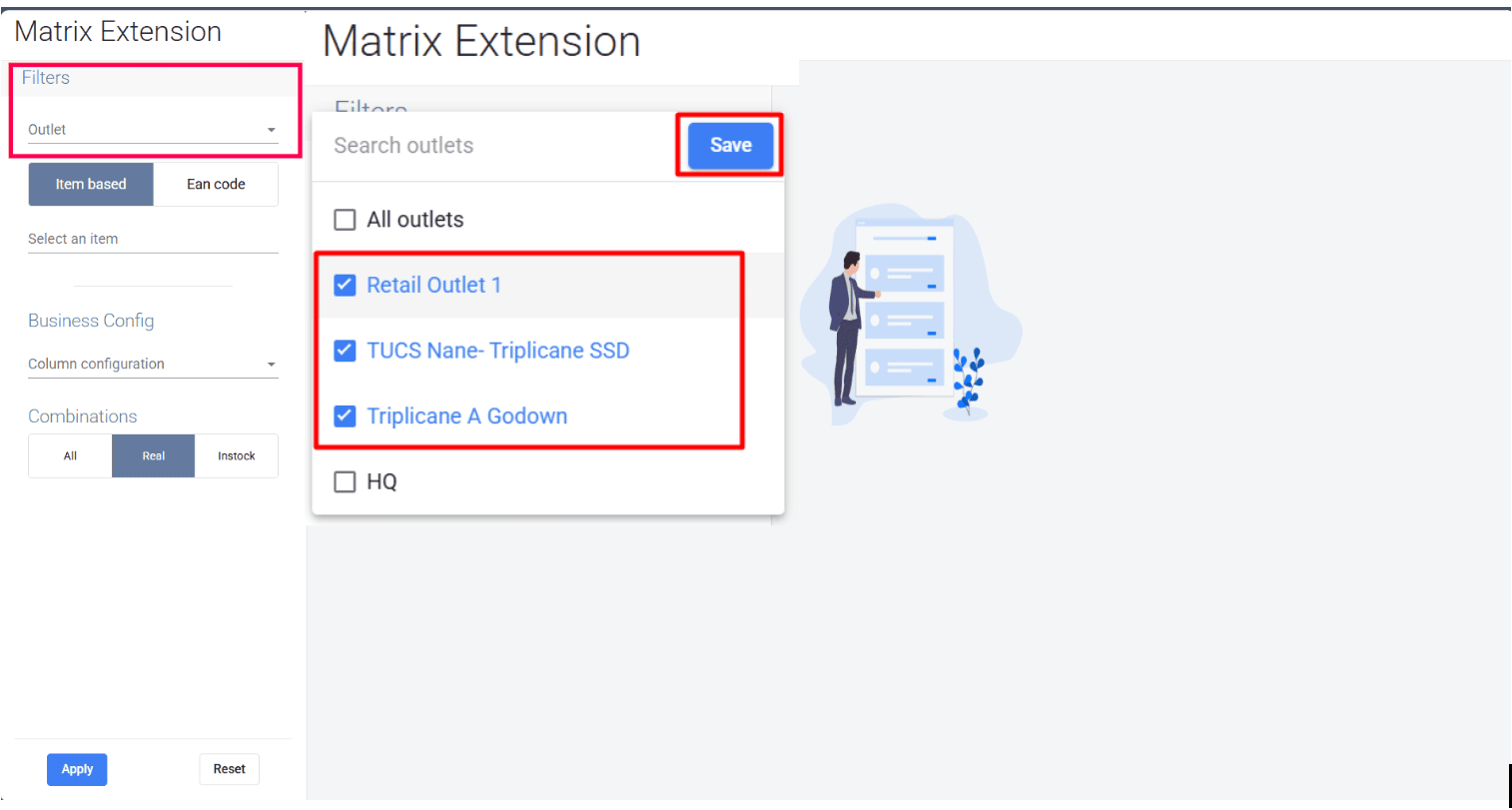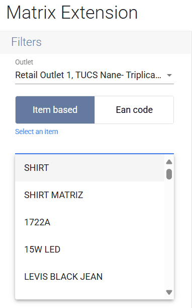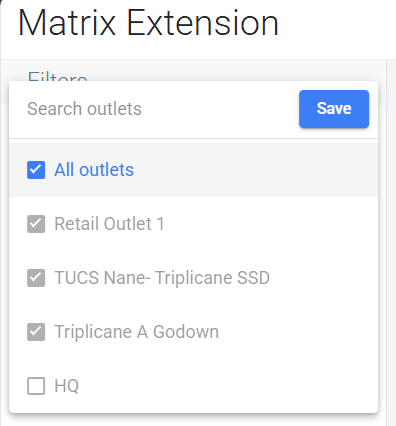 Under Filters, select the required outlets from the list to view and manage the Matrix Item details for those outlets.
