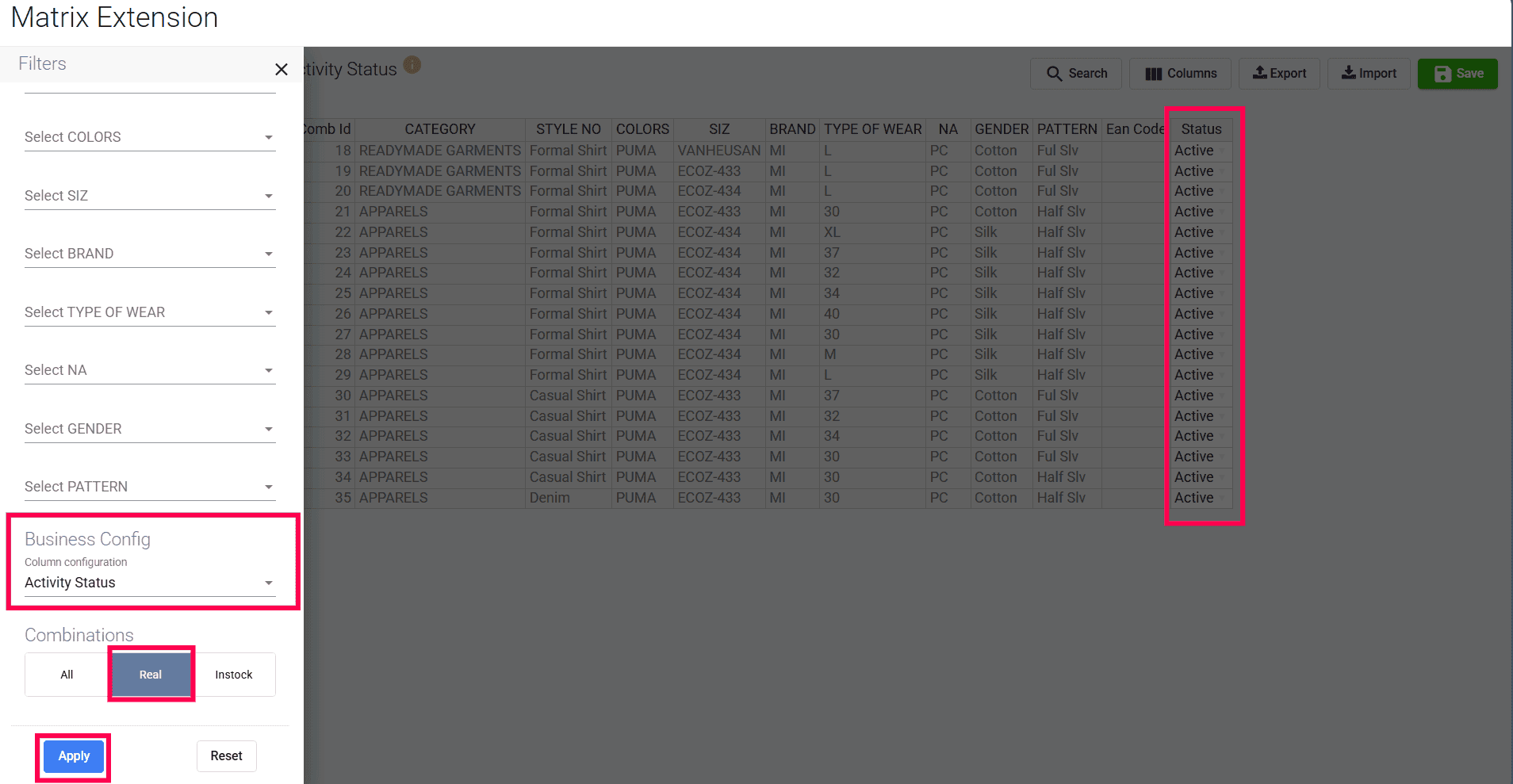 The Activity Status business configuration allows you to update the status (Active / Inactive) of matrix item combinations.