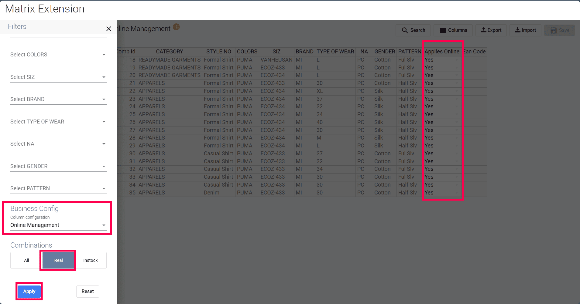 The Online Management business configuration allows you to update the Applies Online option (Yes / No) for matrix item combinations.