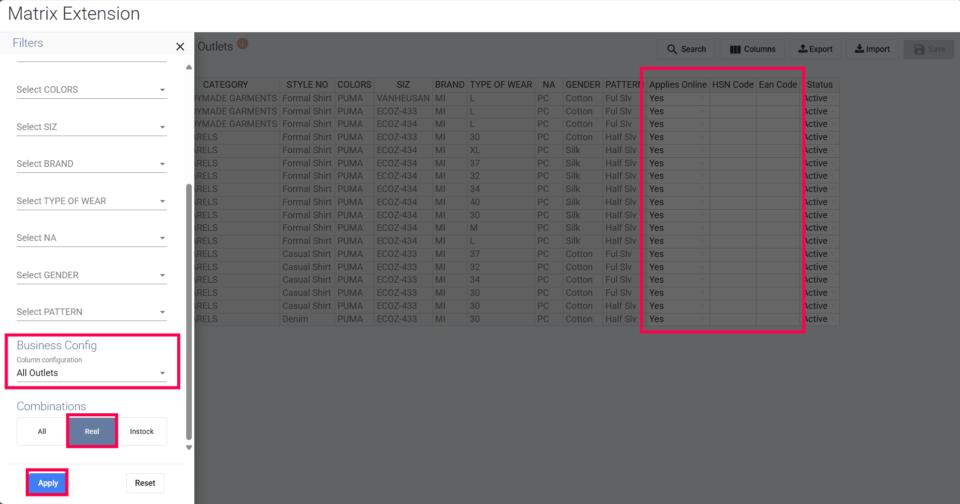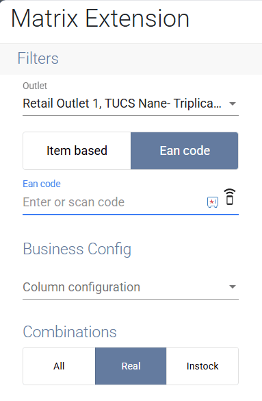 After applying the required filters (Outlets, Item Based/EAN Code, Categories, Business Config, and All/Real/In Stock), you can further narrow down the results using the available Search options.