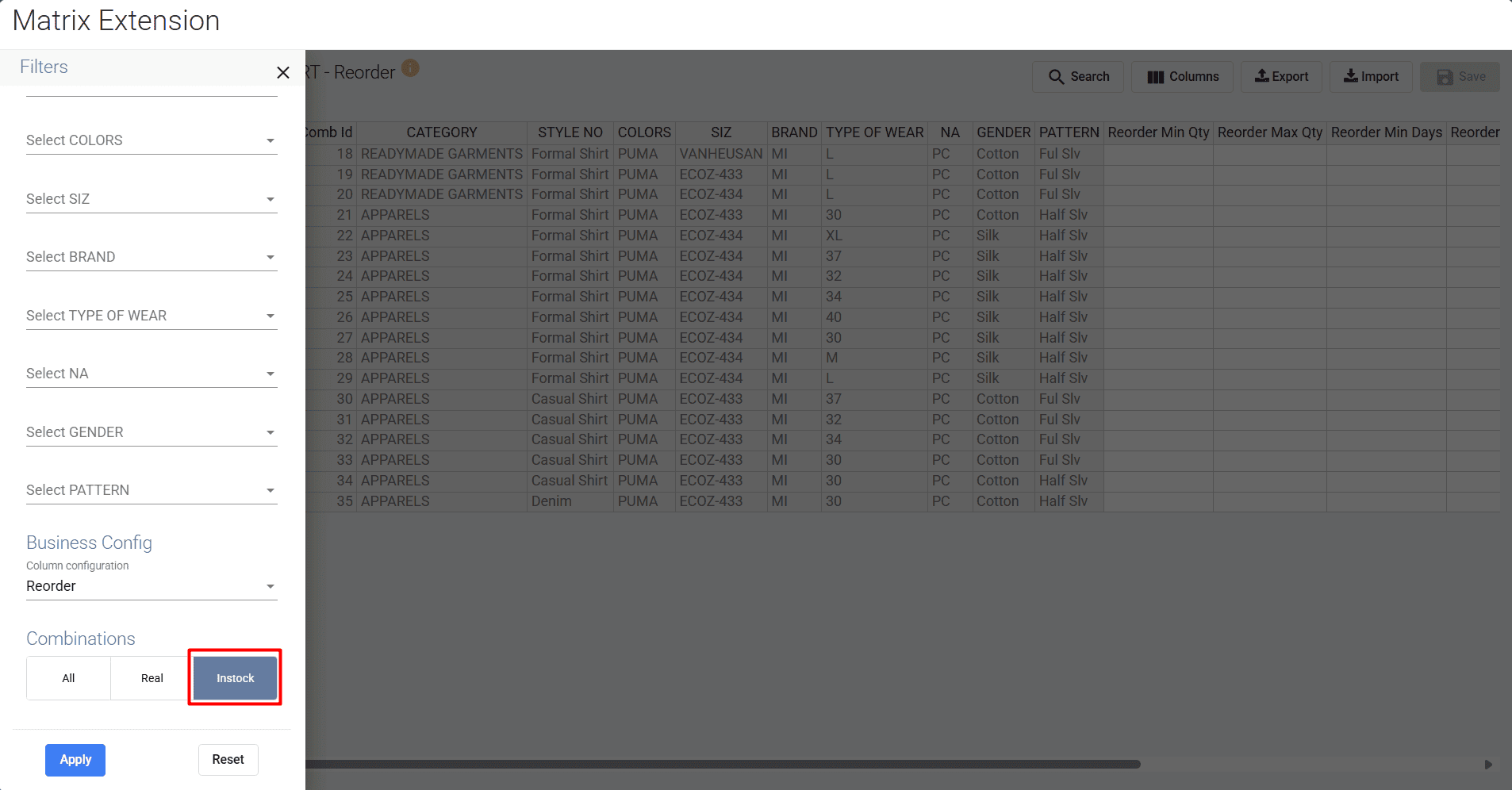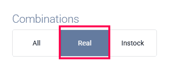 You can now select the required combination view from All / Real / In Stock, based on your requirements: