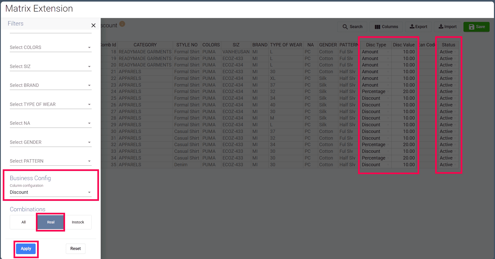 The Discount business configuration allows you to add or update discount details for matrix item combinations.