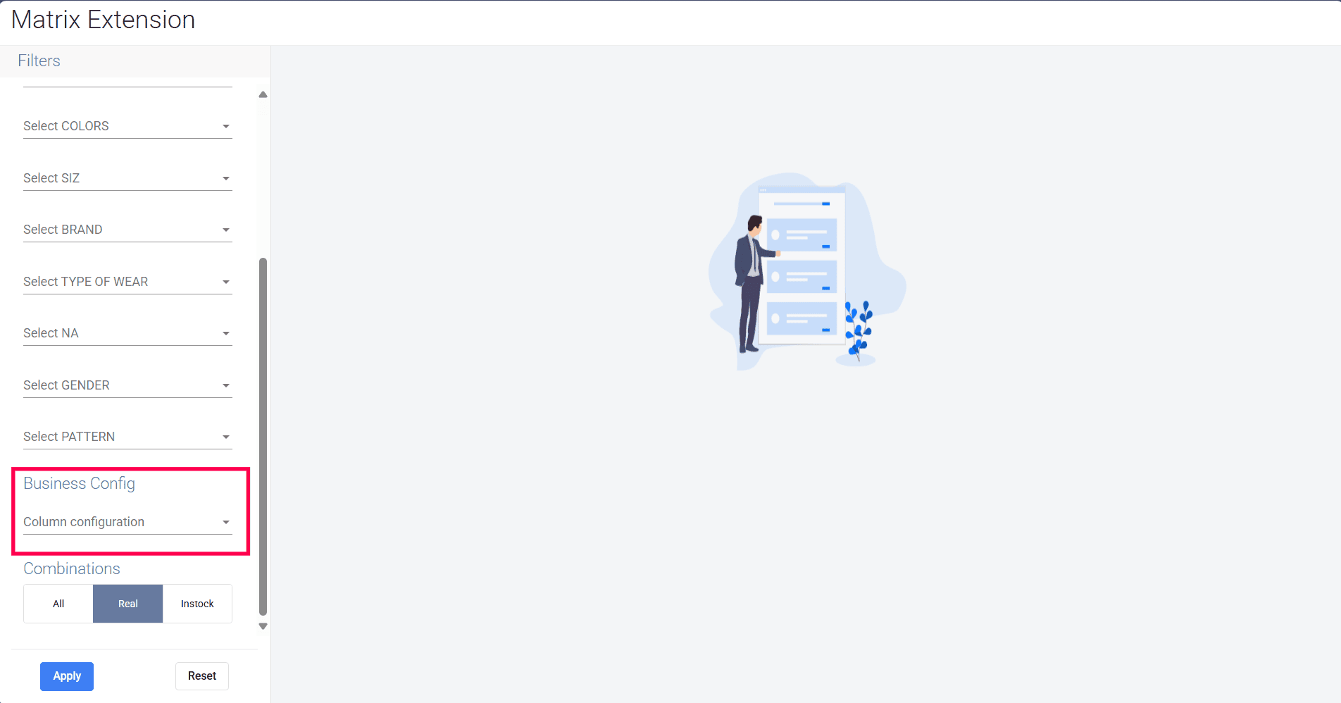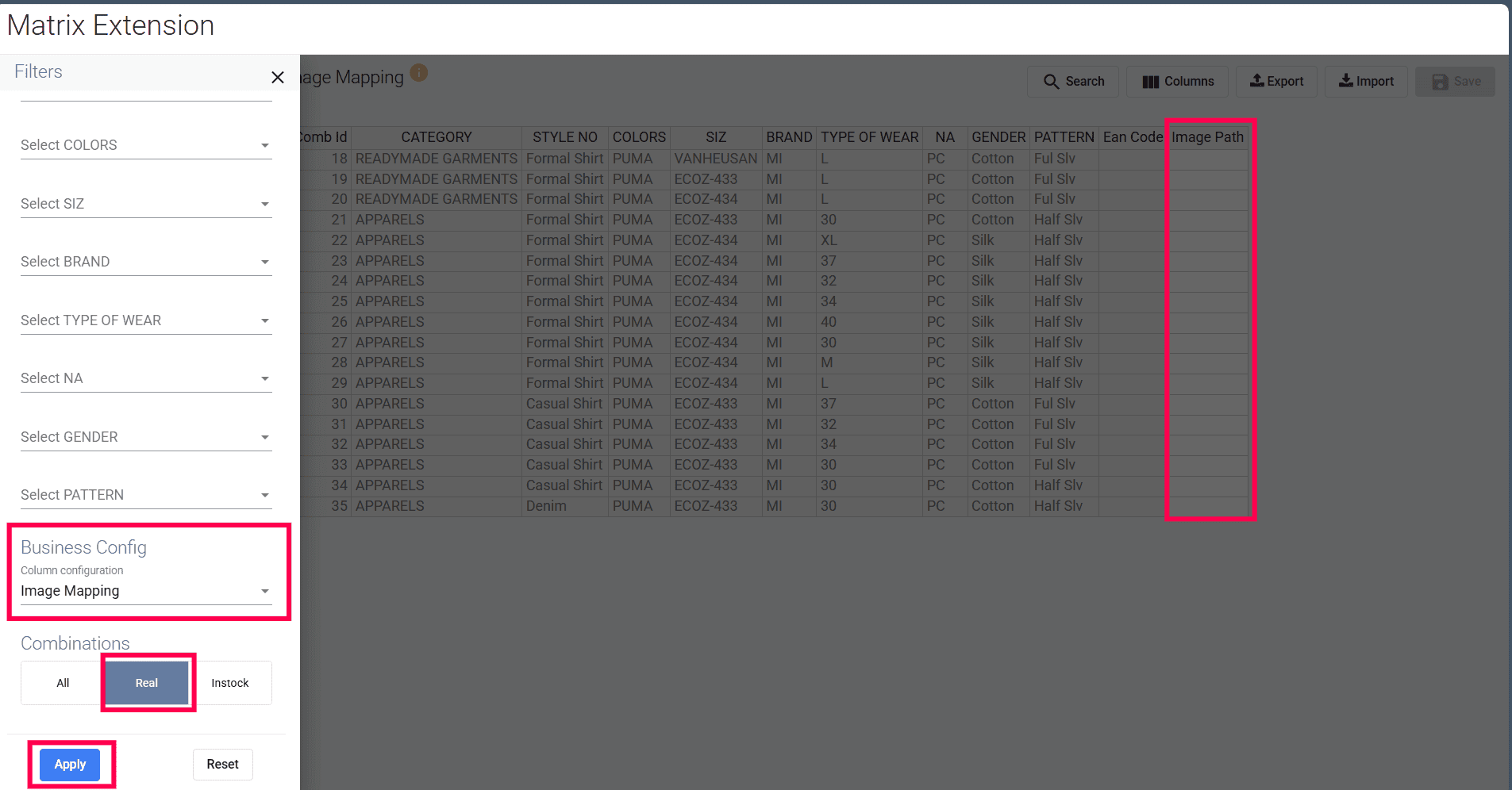 Click the Apply button to load the items on the screen based on the selected filters and configurations.