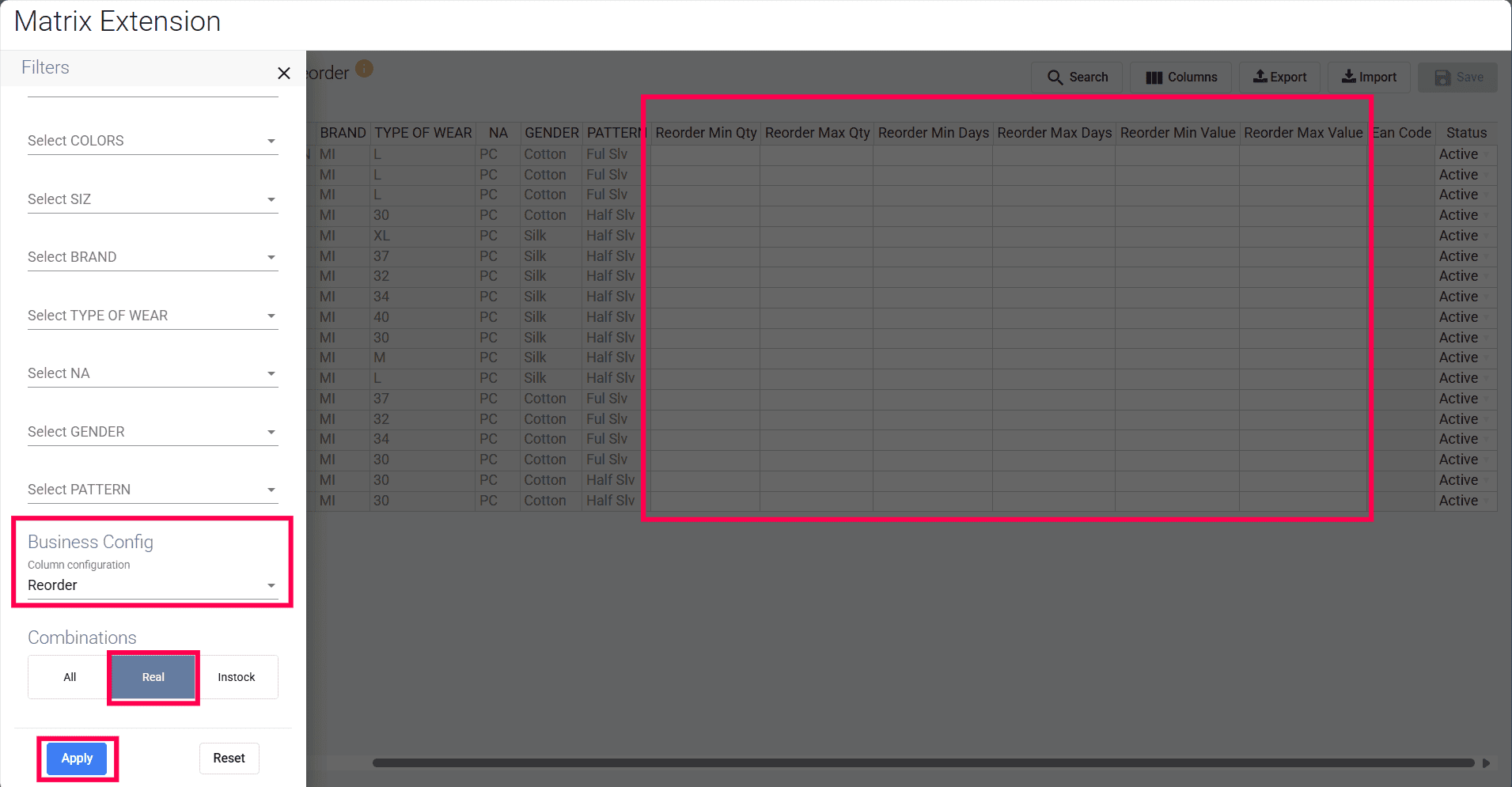 The Reorder business configuration allows you to add or update replenishment parameters for matrix item combinations.