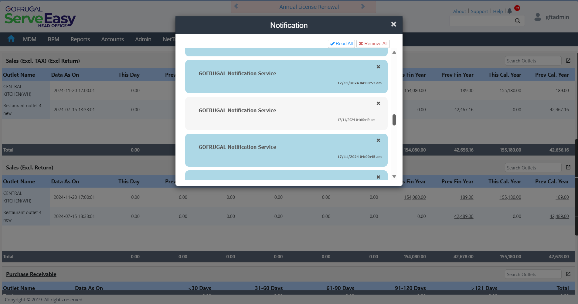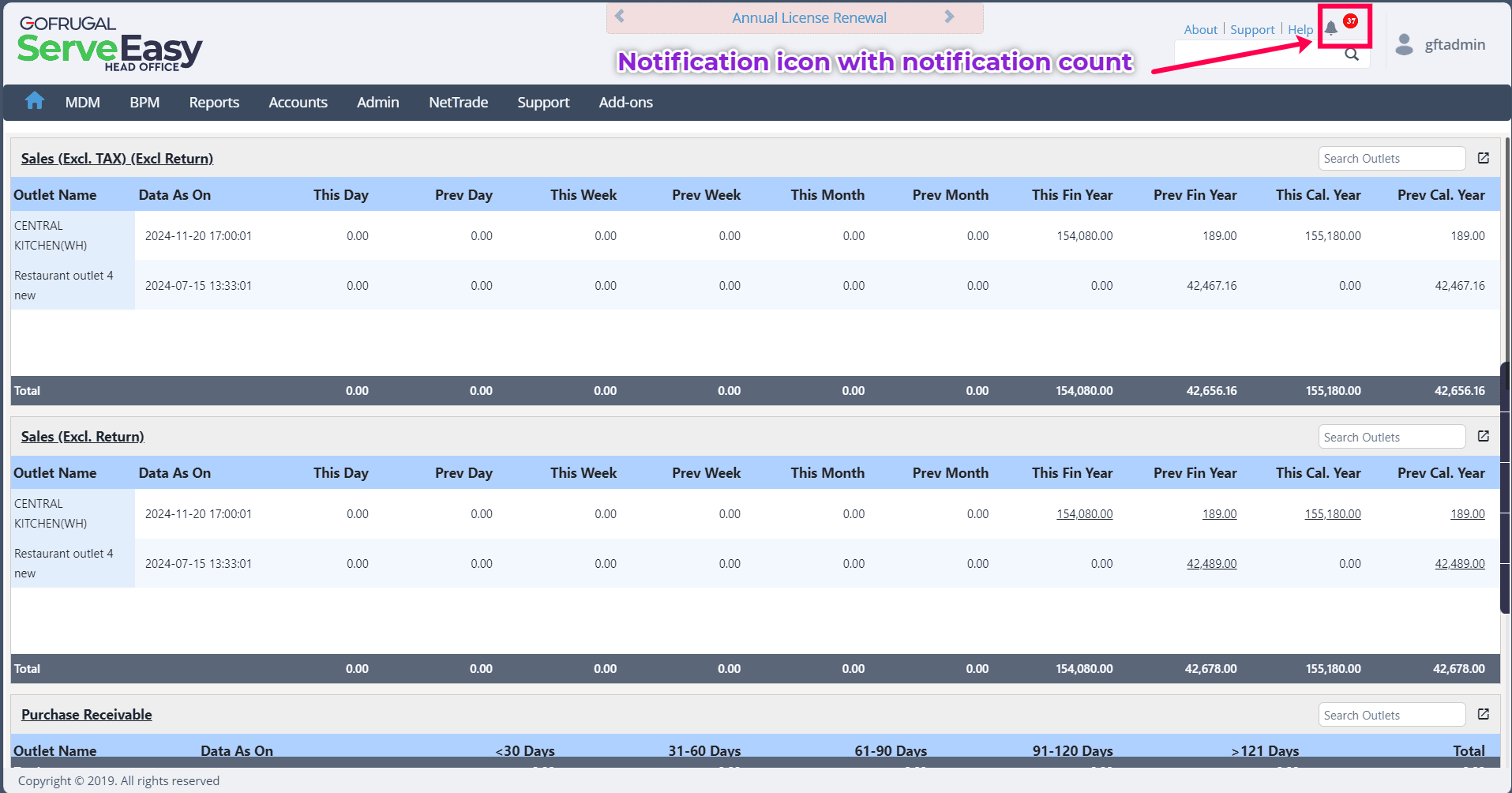 The notification icon within Gofrugal HQ functions as a visual alert that notifies you of critical updates and events on the platform. When new notifications are available, the icon will display a number that reflects the unread notifications. By clicking on the icon, you can access a drop-down menu that presents the most recent notifications. From there, you can select individual notifications to view additional details or take appropriate actions.