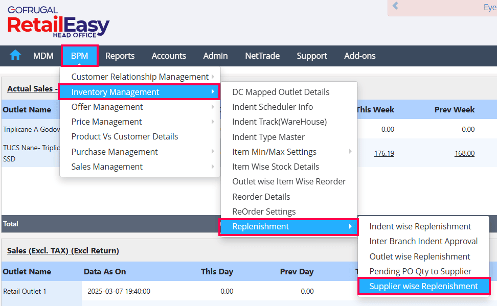 Open HQ and navigate to BPM > Inventory Management > Replenishment > Supplier wise Replenishment.