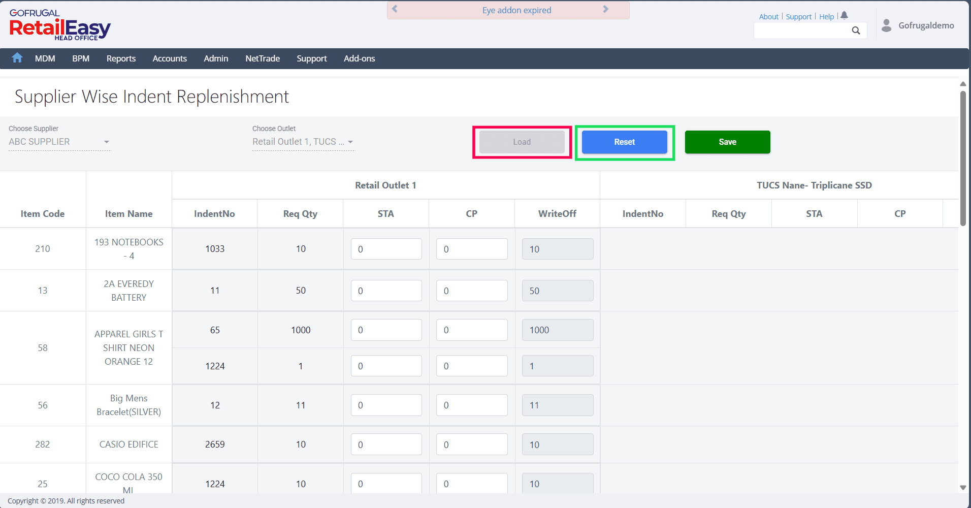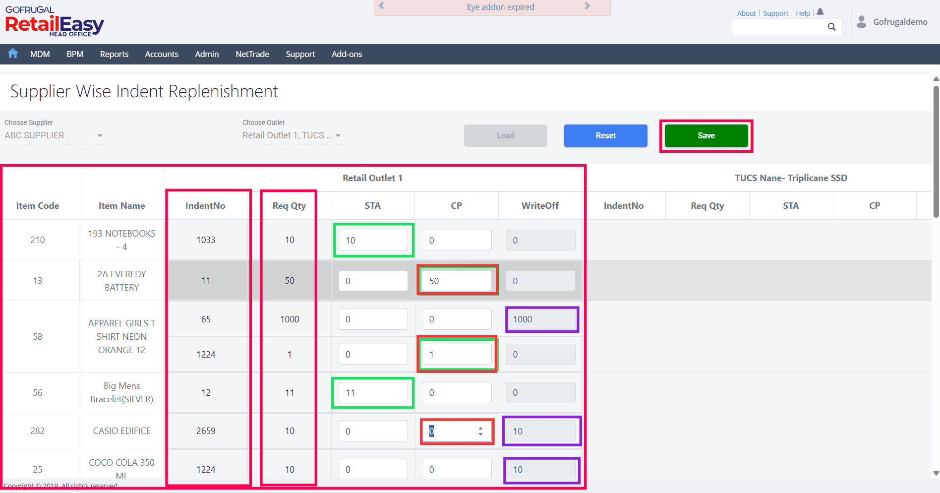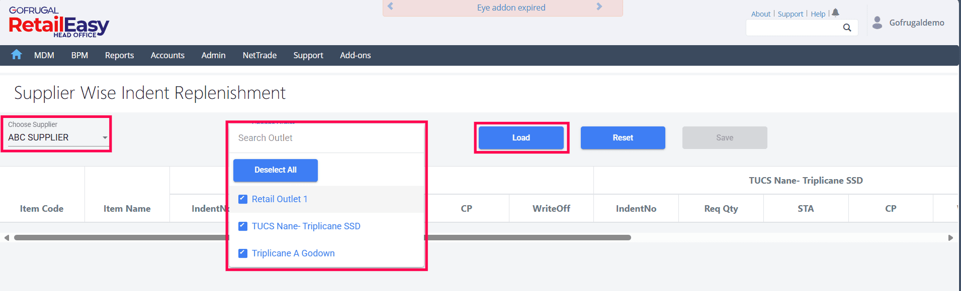 The Supplier Wise Replenishment screen is used to replenish all indents generated across multiple branches at the same time. From this screen, you can select a supplier and include all outlets, excluding the warehouse (DC). Headquarters consolidates the indents from each outlet into a single view. From here, you can issue Stock Transfer Advice and Central Purchase Orders, and you also have the option to write off stock. If you choose not to replenish the stock, you can set both STA and CP quantities to 0, which results in a complete write-off of the quantity.
