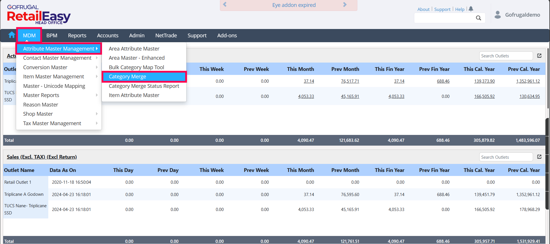 If re-implementation occurs at the outlet where you are attempting to merge categories, the merge will not take place and an error will be displayed. The only option is to deactivate the incorrect category and map the correct category to the items. If the issue persists, please contact our support team for assistance.