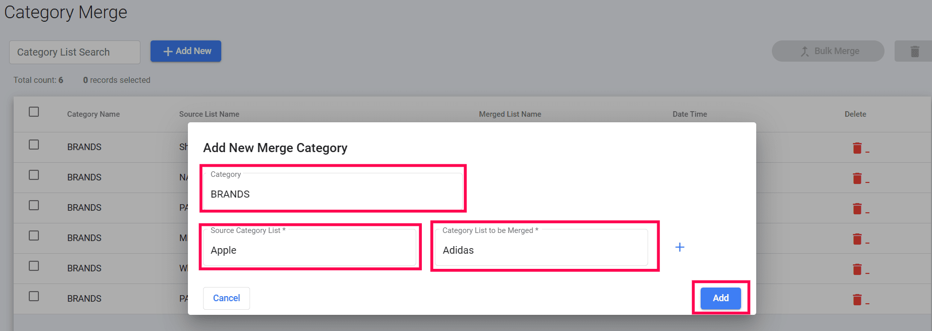 3. On the Category Merge page, click + Add New.
